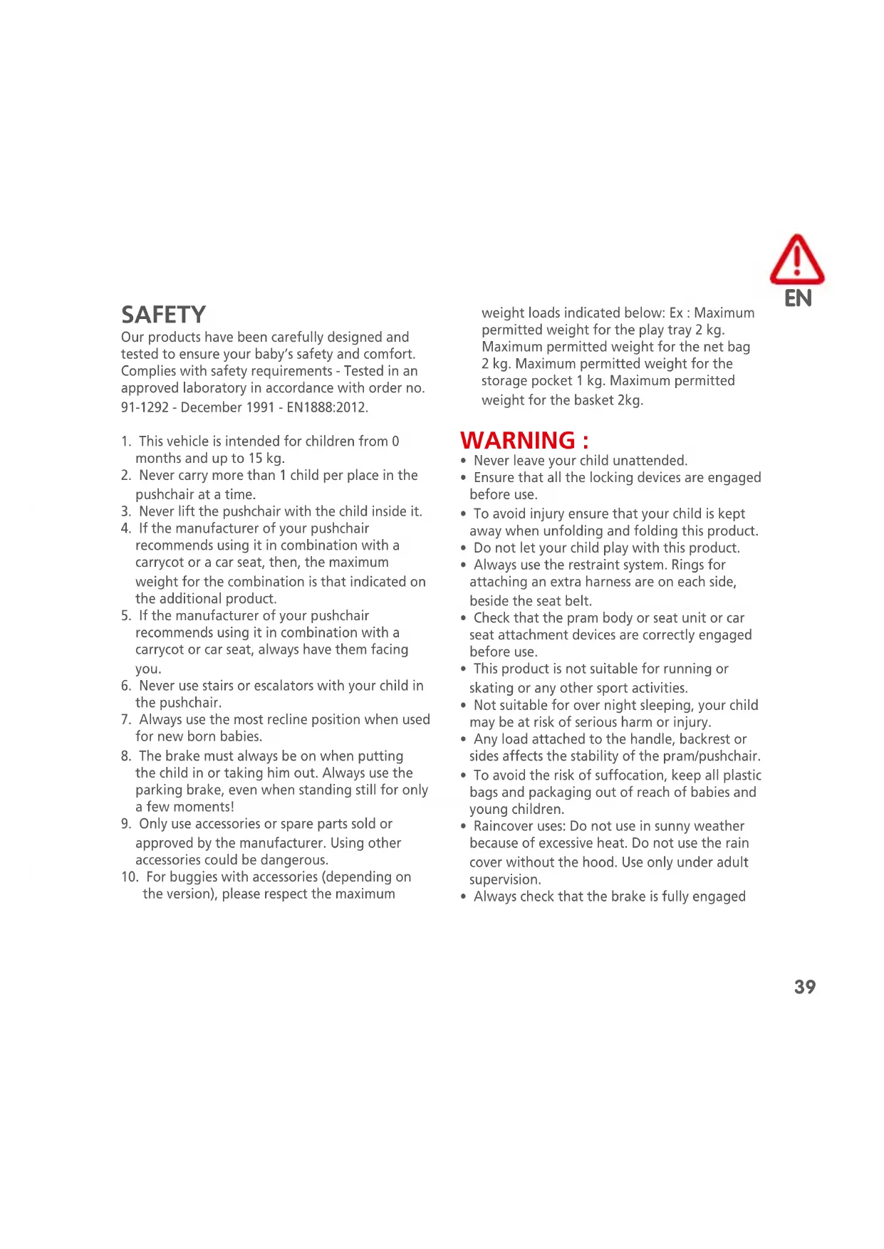 SAFETY Our products have been carefully designed and tested to ensure your baby’s safety and comfort. Complies with safety requirements - Tested in an approved laboratory in accordance with order no. 91-1292 - December 1991 - EN1888:2012.