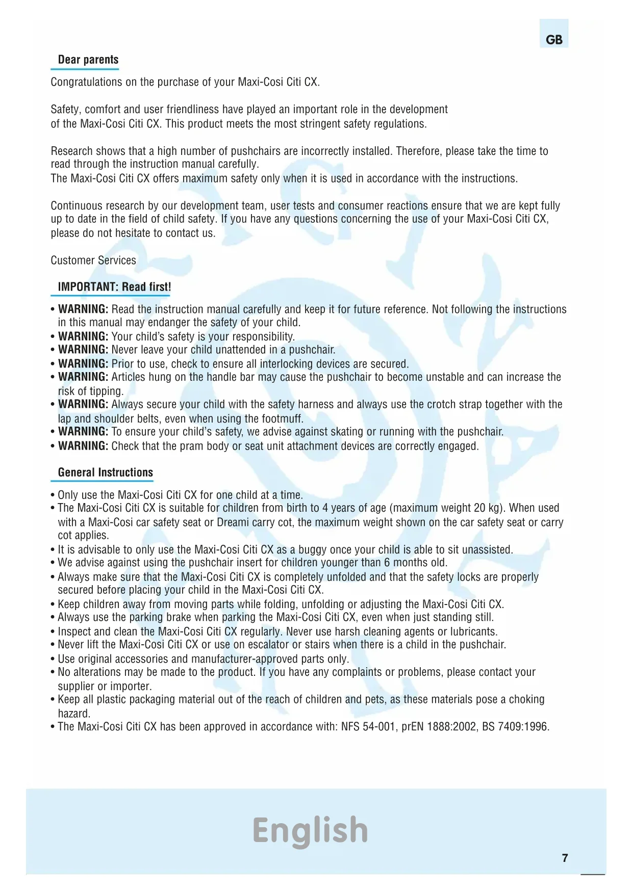 O2 P1 B2 B3 C1 D1 E1 F1 F2 G1 G2 H1 I 1 I 2 EXI0129_GBA_Citi CX_COV_I:-- 13-07-2007 10:23 Pagina 2Dear parents Congratulations on the purchase of your Maxi-Cosi Citi CX. Safety, comfort and user friendliness have played an important role in the development of the Maxi-Cosi Citi CX. This product meets the most stringent safety regulations. Research shows that a high number of pushchairs are incorrectly installed. Therefore, please take the time to read through the instruction manual carefully. The Maxi-Cosi Citi CX offers maximum safety only when it is used in accordance with the instructions. Continuous research by our development team, user tests and consumer reactions ensure that we are kept fully up to date in the field of child safety. If you have any questions concerning the use of your Maxi-Cosi Citi CX, please do not hesitate to contact us. Customer Services IMPORTANT: Read first!