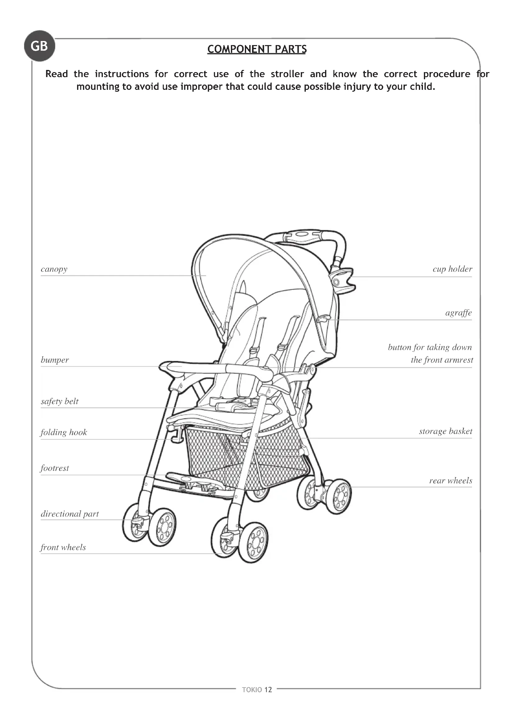 canopy bumper safety belt cup holder agraffe button for taking down the front armrest storage basket folding hook footrest directional part front wheels rear wheelsTOKIO 13 The iconograph is to better illustrate the operation means and structure of the product. When there are some differences between the practical and the inset, the practical is conrmed. In order to better improving the quality, we may make some change on some parts of the structure and appearance without informing, please understand. Note: Fix the brake line to the frame using the Velcro on both sides. Keep the brake line outside of the basket. The wheel with brake could be xed on either side of the stroller. CAUTION GBTOKIO 14