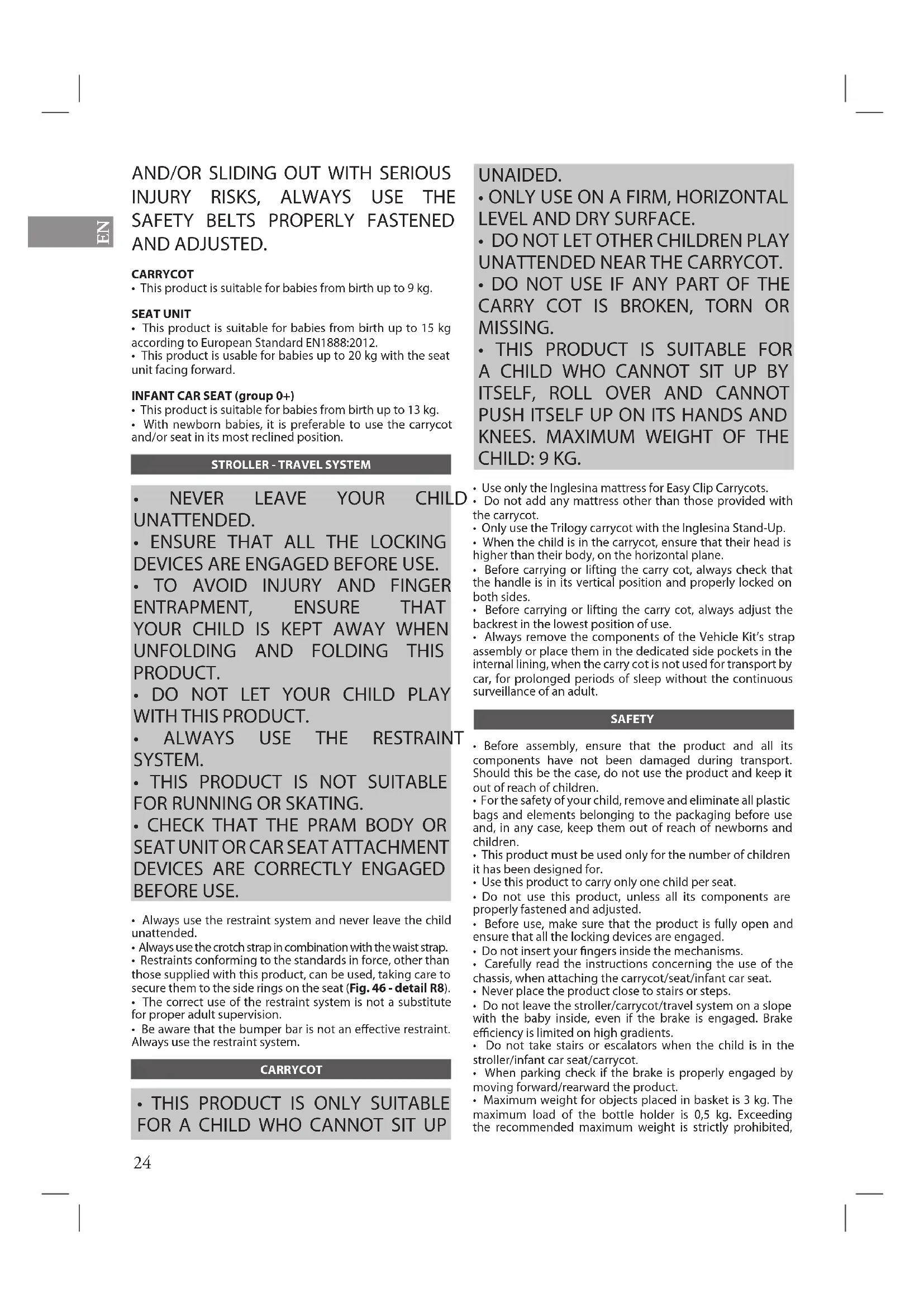 - Use only with Trilogy carrycot and Huggy Multix infant car seat by Inglesina specically designed and provided with Easy Clip hooking system. If in doubt, visit inglesina.com or contact your Authorised Retailer or the Inglesina Customer Care Service.