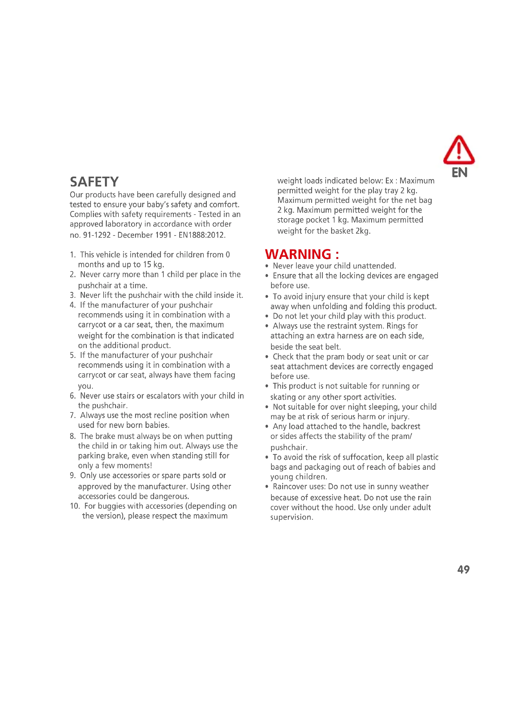 SAFETY Our products have been carefully designed and tested to ensure your baby’s safety and comfort. Complies with safety requirements - Tested in an approved laboratory in accordance with order no. 91-1292 - December 1991 - EN1888:2012.