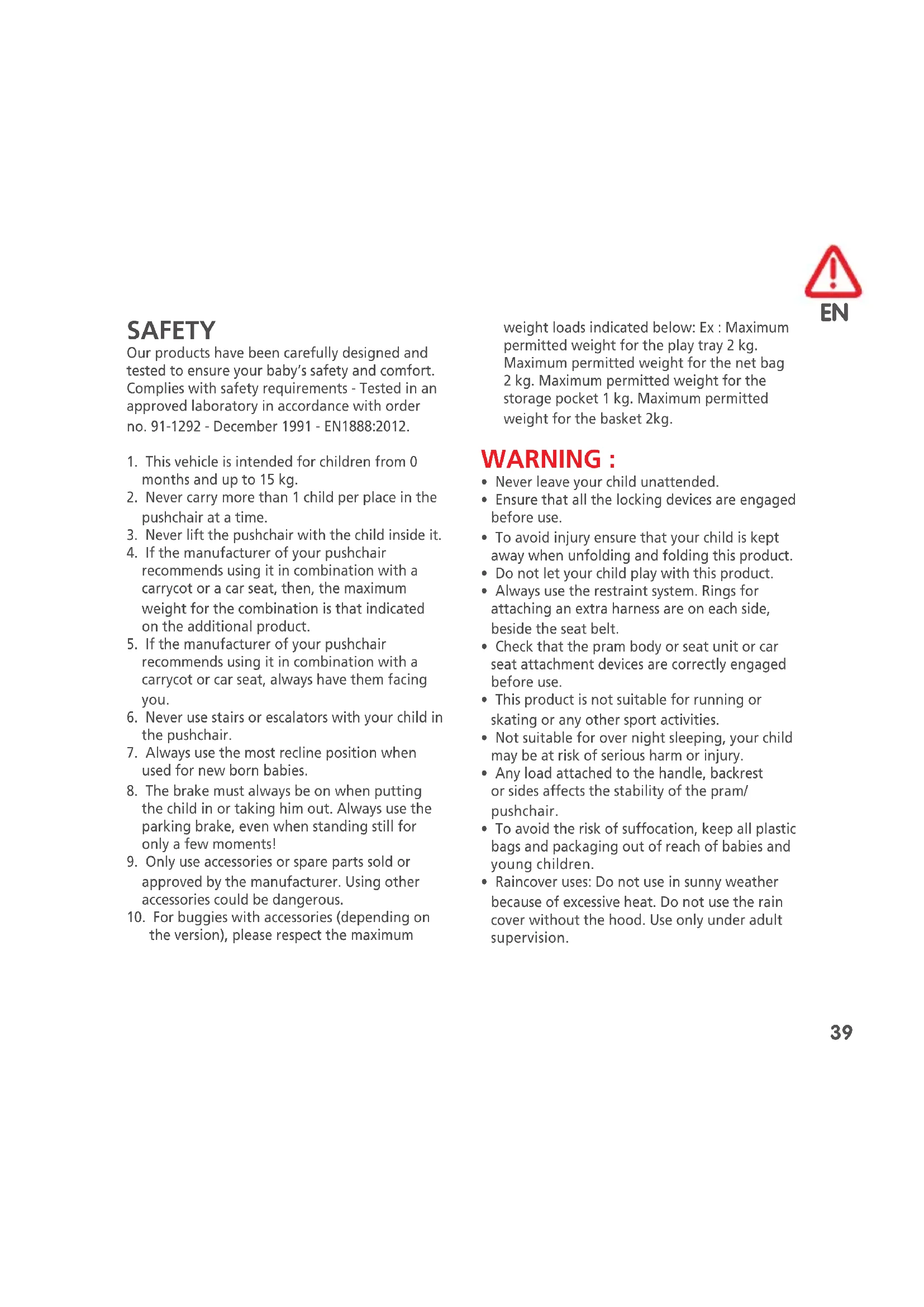 SAFETY Our products have been carefully designed and tested to ensure your baby’s safety and comfort. Complies with safety requirements - Tested in an approved laboratory in accordance with order no. 91-1292 - December 1991 - EN1888:2012.