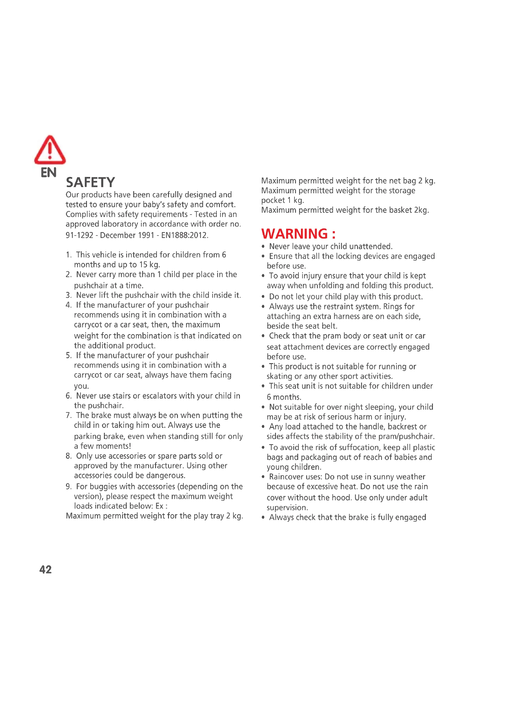 SAFETY Our products have been carefully designed and tested to ensure your baby’s safety and comfort. Complies with safety requirements - Tested in an approved laboratory in accordance with order no. 91-1292 - December 1991 - EN1888:2012.