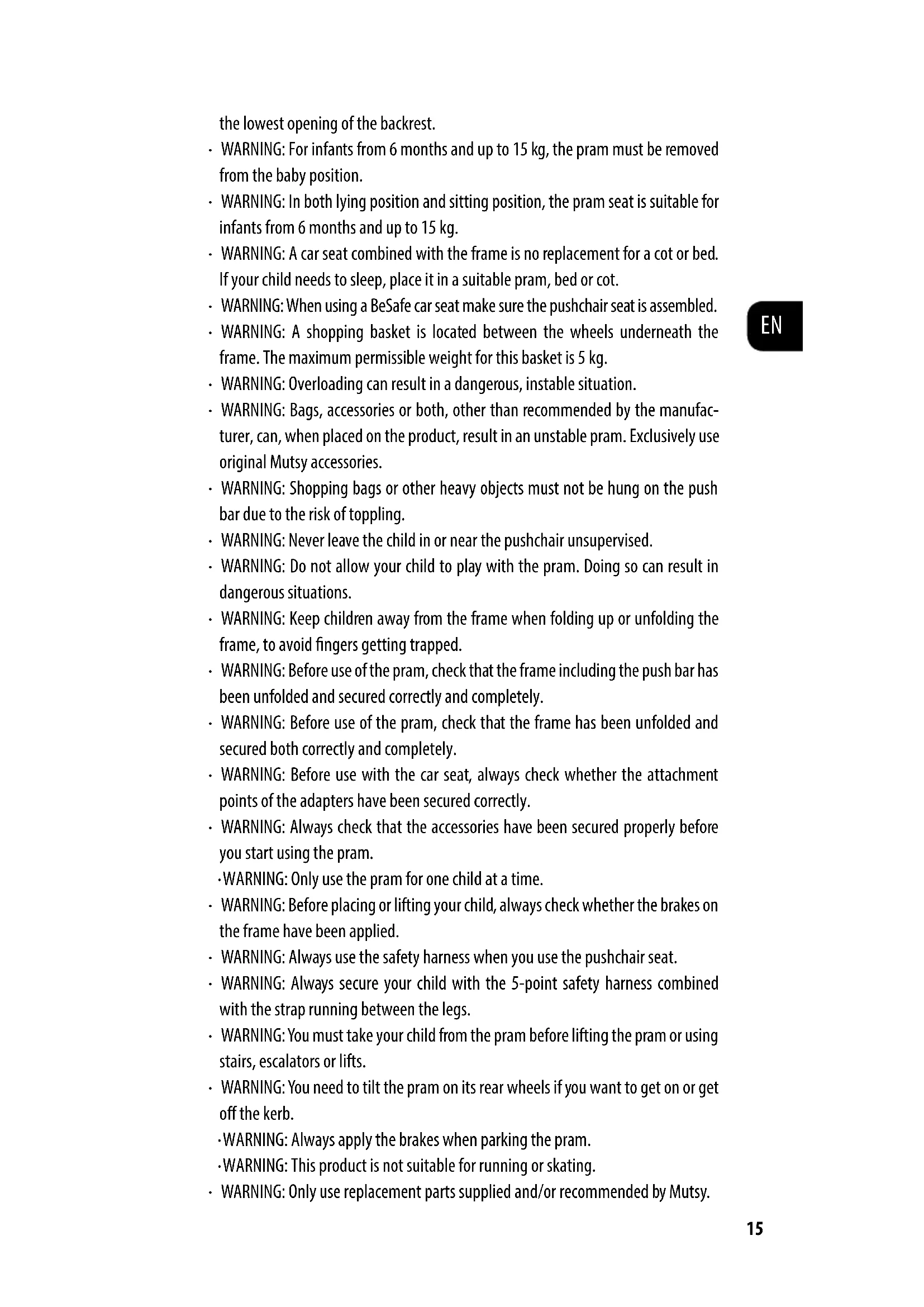 -WARNING: The pram is suitable for infants from birth up to 15kg