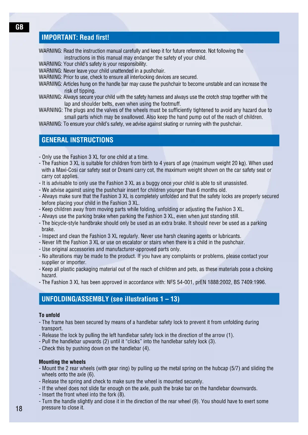 GENERAL INSTRUCTIONS - Only use the Fashion 3 XL for one child at a time. - The Fashion 3 XL is suitable for children from birth to 4 years of age (maximum weight 20 kg). When used with a Maxi-Cosi car safety seat or Dreami carry cot, the maximum weight shown on the car safety seat or carry cot applies. - It is advisable to only use the Fashion 3 XL as a buggy once your child is able to sit unassisted. - We advise against using the pushchair insert for children younger than 6 months old. - Always make sure that the Fashion 3 XL is completely unfolded and that the safety locks are properly secured before placing your child in the Fashion 3 XL. - Keep children away from moving parts while folding, unfolding or adjusting the Fashion 3 XL. - Always use the parking brake when parking the Fashion 3 XL, even when just standing still. - The bicycle-style handbrake should only be used as an extra brake. It should never be used as a parking brake. - Inspect and clean the Fashion 3 XL regularly. Never use harsh cleaning agents or lubricants. - Never lift the Fashion 3 XL or use on escalator or stairs when there is a child in the pushchair. - Use original accessories and manufacturer-approved parts only. - No alterations may be made to the product. If you have any complaints or problems, please contact your supplier or importer. - Keep all plastic packaging material out of the reach of children and pets, as these materials pose a choking hazard. - The Fashion 3 XL has been approved in accordance with: NFS 54-001, prEN 1888:2002, BS 7409:1996. UNFOLDING/ASSEMBLY (see illustrations 1 – 13) To unfold - The frame has been secured by means of a handlebar safety lock to prevent it from unfolding during transport. - Release the lock by pulling the left handlebar safety lock in the direction of the arrow (1). - Pull the handlebar upwards (2) until it “clicks” into the handlebar safety lock (3). - Check this by pushing down on the handlebar (4). Mounting the wheels - Mount the 2 rear wheels (with gear ring) by pulling up the metal spring on the hubcap (5/7) and sliding the wheels onto the axle (6). - Release the spring and check to make sure the wheel is mounted securely. - If the wheel does not slide far enough on the axle, push the brake bar on the handlebar downwards. - Insert the front wheel into the fork (8). - Turn the handle slightly and close it in the direction of the rear wheel (9). You should have to exert some pressure to close it. 18GB