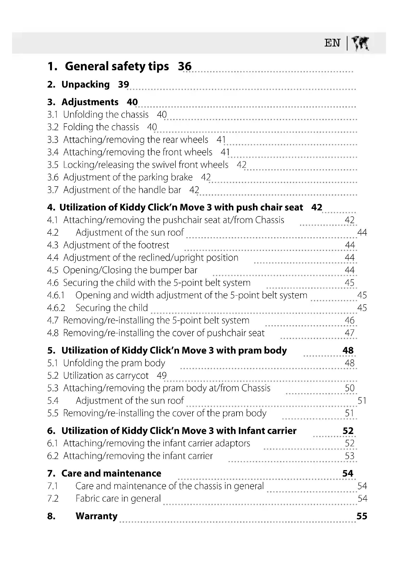 Operation manual Kiddy Click’n Move 3 IMPORTANT Keep this instructions for further reference. We’re delighted that you have chosen the Kiddy Click’n Move 3 as your preferred travelsystem. The Kiddy Click’n Move 3 is the latest innovative product in our stroller line. This stroller is a first-class product that guarantees a long-term useful life, if used cor- rectly. Your Kiddy Click’n Move 3 is EN 1888 and EN 1466 tested and homologated. Your Kiddy Click’n Move 3 is suitable for children from birth up to the age of ap- proxi-mately 4 years or 20 kg. However, the following appropriate specifications for the respective age groups must be applied: infant carrier: from birth to max. 13 kg (approx. 1.5 years) carrycot: from birth to max. 9 kg (approx. 6 months) push chair seat: from 9 kg up to 20 kg (approx. 4 years) 1.General safety tips Read these instructions carefully before use and keep them for future reference. Your child’s safety may be affected if you do not follow these instructions. WARNING Never leave your child unattended. 36EN