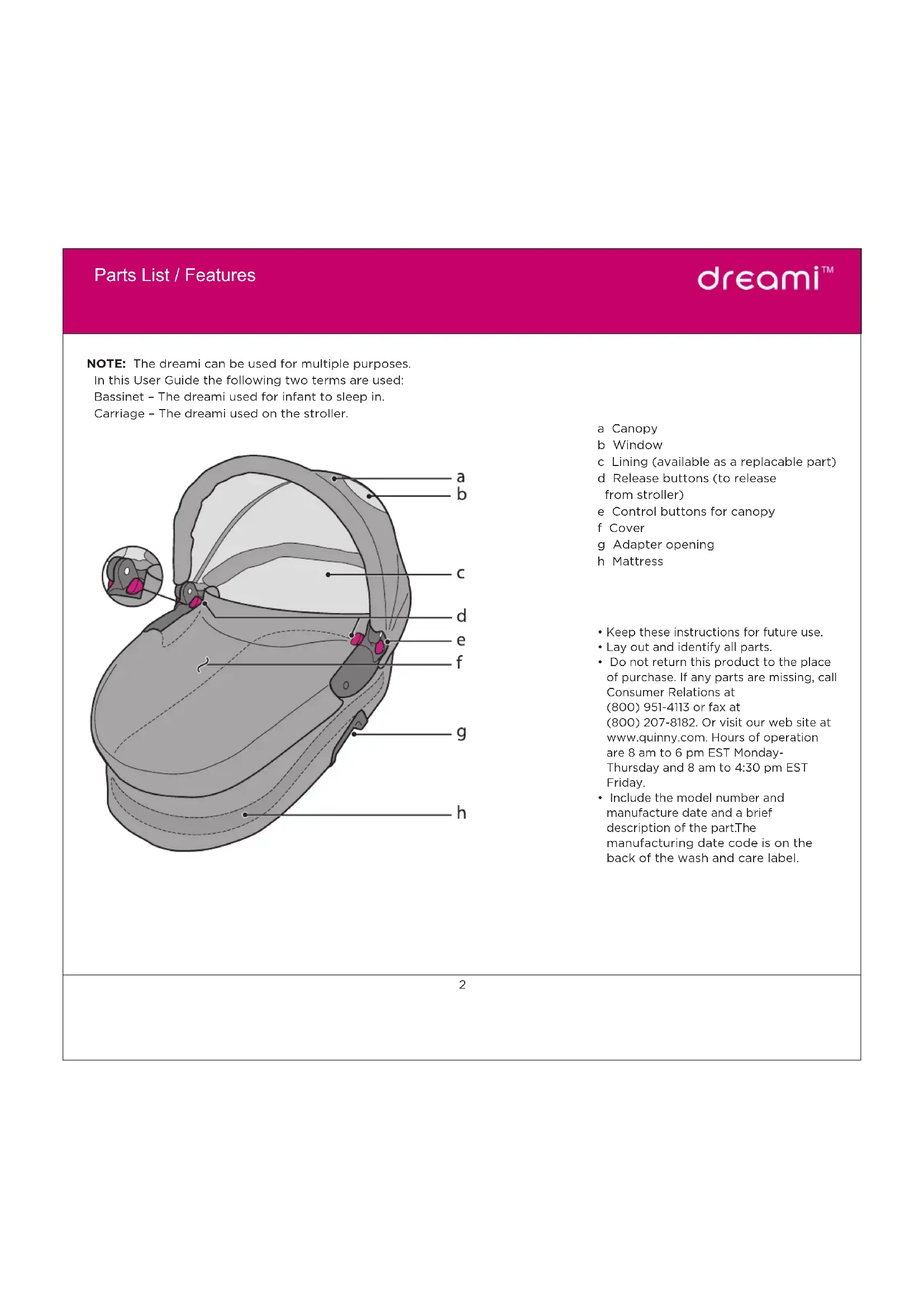 - Include the model number and manufacture date and a brief description of the part. The manufacturing date code is on the back of the wash and care label. a Canopy b Window c Lining (available as a replacable part) d Release buttons (to release from stroller) e Control buttons for canopy f Cover g Adapter opening h Mattress NOTE: The dreami can be used for multiple purposes. In this User Guide the following two terms are used: Bassinet – The dreami used for infant to sleep in. Carriage – The dreami used on the stroller.Parts List / Features Warnings Care & Maintenance Warranty To Use Contents Warnings To Use Bug Net & Rain Shield To Use