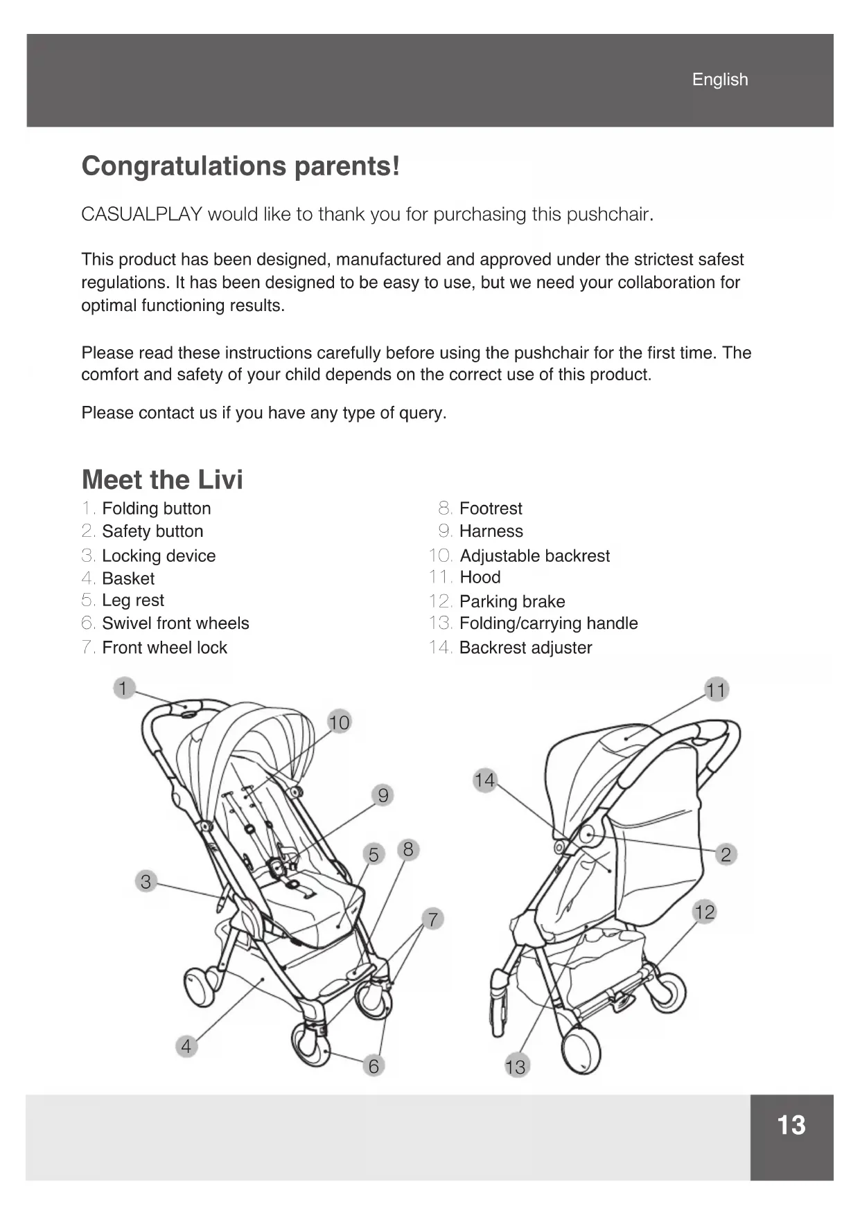 - No poden utilitzar-se accessoris no aprovats per el fabricant.13 Congratulations parents! CASUALPLAY would like to thank you for purchasing this pushchair. This product has been designed, manufactured and approved under the strictest safest regulations. It has been designed to be easy to use, but we need your collaboration for optimal functioning results. Please read these instructions carefully before using the pushchair for the rst time. The comfort and safety of your child depends on the correct use of this product. Please contact us if you have any type of query. Meet the Livi