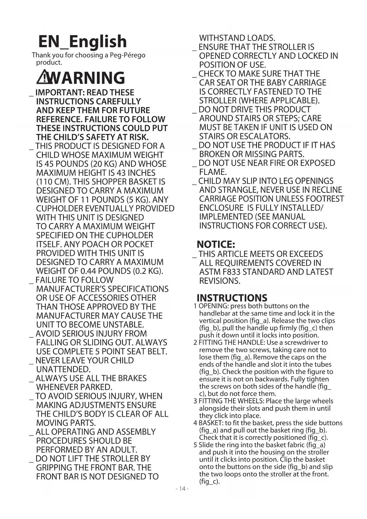 REVISIONS. INSTRUCTIONS 1 OPENING: press both buttons on the handlebar at the same time and lock it in the vertical position (fig_a). Release the two clips (fig_b), pull the handle up firmly (fig_c) then push it down until it locks into position. 2 FITTING THE HANDLE: Use a screwdriver to remove the two screws, taking care not to lose them (fig_a). Remove the caps on the ends of the handle and slot it into the tubes (fig_b). Check the position with the figure to ensure it is not on backwards. Fully tighten the screws on both sides of the handle (fig_ c), but do not force them. 3 FITTING THE WHEELS: Place the large wheels alongside their slots and push them in until they click into place. 4 BASKET: to fit the basket, press the side buttons (fig_a) and pull out the basket ring (fig_b). Check that it is correctly positioned (fig_c). 5 Slide the ring into the basket fabric (fig_a) and push it into the housing on the stroller until it clicks into position. Clip the basket onto the buttons on the side (fig_b) and slip the two loops onto the stroller at the front. (fig_c).- 15 - 6 The stroller basket has three positions. The normal position can be seen in Figure A. The basket can be lowered to allow it to be used even when the backrest is completely lowered. By pressing on it, it is easier to fill it without disturbing the baby (fig_b). The basket can also be raised to allow access to the rear footboard (fig_c). 7 FRONT BAR: insert the front bar (fig_a) and press until the first click. Pull the levers under the front bar towards you (fig_b) and insert it completely by pushing it forwards (fig_c). 8 The front bar can be lengthened to two positions. To move it to the first position, pull the two levers underneath towards you (fig_ a) and pull it until the first click (fig_b). To move it to the second position, pull the two levers and the front bar towards you again until the second click (fig_c). It is dangerous to put hot drinks on the tray. 9 BRAKE: to brake the stroller, push the brake levers on the wheels downwards with your foot, as shown in the figure. Always set the brake when the stroller is not moving. 10 5-POINT SAFETY HARNESS: to attach the safety harness, insert the two buckles of the waist strap (with shoulder straps attached – arrow_a) into the leg divider strap until it clicks into place (arrow_b). To release, push the round button placed in center of the buckle upwards (arrow_c) and pull the waist strap to the sides (arrow_d). 11 To tighten the waist strap, pull on both sides in the direction of the arrow (arrow_a). To loosen it do the opposite. The waist strap can be tightened as far as the safety lock (fig_b). 12 To adjust the height of the safety harnesses, release the two buckles on the rear of the backrest. Pull the shoulder straps towards you (arrow_a) until the buckles are released and insert them in the backrest loops (arrow_b). Remove the shoulder straps from the sack (arrow_c) and insert them in the most appropriate loop (arrow_d), then re-attach the two buckles on the rear of the backrest (arrow_e). 13 ADJUSTING THE BACKREST: the stroller backrest can be reclined in three positions. To lower it, raise the handle (fig_a) and at the same time lock it into the desired position (fig_b); push upwards to raise it. 14 ADJUSTING THE FOOTREST: the footrest has two positions. To lower it, pull the two switches downwards and lower the footrest at the same time (fig_a). To raise it, pull it up until it clicks (fig_b). 15 SWIVEL WHEELS: the smaller wheels on the stroller swivel. To make them swivel, raise the lever (fig_a). Lower the level to set them in their fixed position (fig_b). 16 HANDLEBAR: to make the handlebar reversible, pull the clips on it upwards at the same time (fig_a) and move it to the other side until the final click. IMPORTANT: take care not to hurt the child’s hands or arms when doing this. Adjust the height of the handlebar by pressing on both side buttons at the same time (fig_b). 17 DRINK HOLDER: the drink holder can be attached to both sides of the stroller. Simply click it into place. 18 CARRIAGE AND/OR STROLLER: Uno becomes a carriage when the backrest is in its lowest position, the footrest is raised, the handlebar is on the opposite side to the backrest and the swivelling wheels are also on the opposite side to the backrest (fig_a). Uno becomes a stroller when the backrest is raised, the footrest is lowered, the handlebar is on the same side as the backrest and the swivel wheels are on the opposite side to the backrest (fig_b). 19 HOOD: turn back the front edge of the hood (fig_a), insert the clips in the slots in the stroller arms (fig_b) and button them to the rear of the backrest. Button the hood to the insides of the armrests (fig_c) and stretch it, lowering the joints (fig_d). To transform the hood into a sun canopy, open the zip (fig_e) and unbutton the rest of the hood. 20 COVER: to transform Uno into a carriage, first lengthen the front bar to the second position and raise the footrest, slide out the lower part of the cover from under the footrest sack and insert the tabs of the lower part of the front cover in the slots of the front bar (fig_b). The slots in the front bar will come out when the front bar is lengthened. If the slots slide back into position, push the two levers under the front bar towards you. Finally, slip the side eyelets onto the armrests (fig_c). The carriage version without a cover can be seen in Figure D. 21 Zip the upper part of the cover to the lower part, slip the side eyelets onto the armrests in sequence (fig_a) and button the cover to the armrests (fig_b). The carriage version with a cover can be seen in Figure C. 22 REMOVING THE WHEELS: to remove the large wheels, press the button (fig_a) and slide the wheel out (fig_b). To remove the small wheels, press the switch inwards (fig_c) and slide out the wheel at the same time (fig_d). CLOSING: Before closing the stroller, make sure that the handlebar is positioned on t