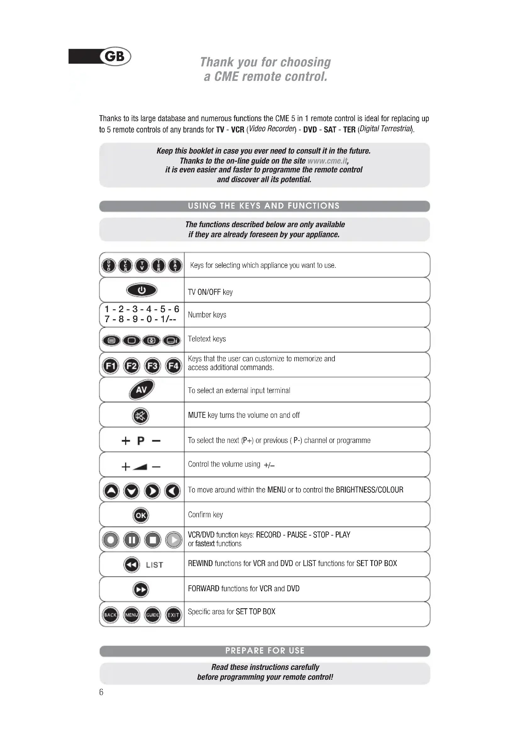 The functions described below are only available if they are already foreseen by your appliance. Keep this booklet in case you ever need to consult it in the future. Thanks to the on-line guide on the site www.cme.it, it is even easier and faster to programme the remote control and discover all its potential. Thanks to its large database and numerous functions the CME 5 in 1 remote control is ideal for replacing upto 5 remote controls of any brands for TV - VCR ( Video Recorder
