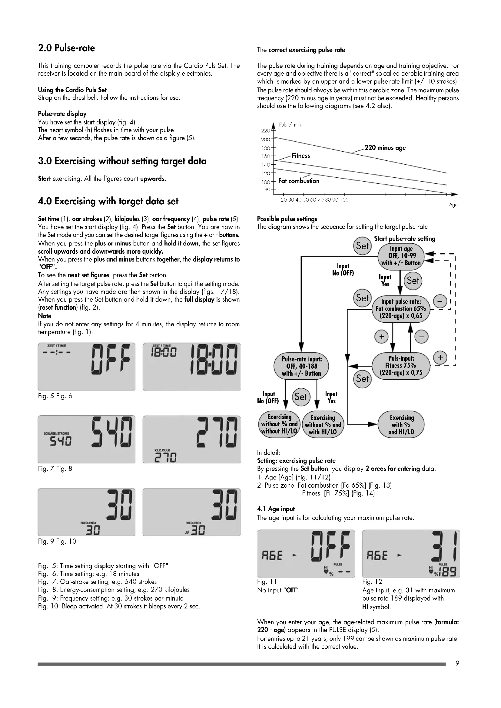 Pulse-rate input: OFF, 40-188 with +/- Button Puls-input: Fitness 75% (220-age) x 0,75 Input pulse rate: Fat combustion 65% (220-age) x 0,65 Input age OFF, 10-99 with +/- Button Exercising with % and HI/LO Input No (OFF) Input No (OFF) Input Yes Input Yes Exercising without % and without HI/LO Exercising without % and with HI/LO Start pulse-rate setting Fig. 11 No input “OFF” Fig. 12 Age input, e.g. 31 with maximum pulse-rate 189 displayed with HI symbol. Fat combustion Fitness10