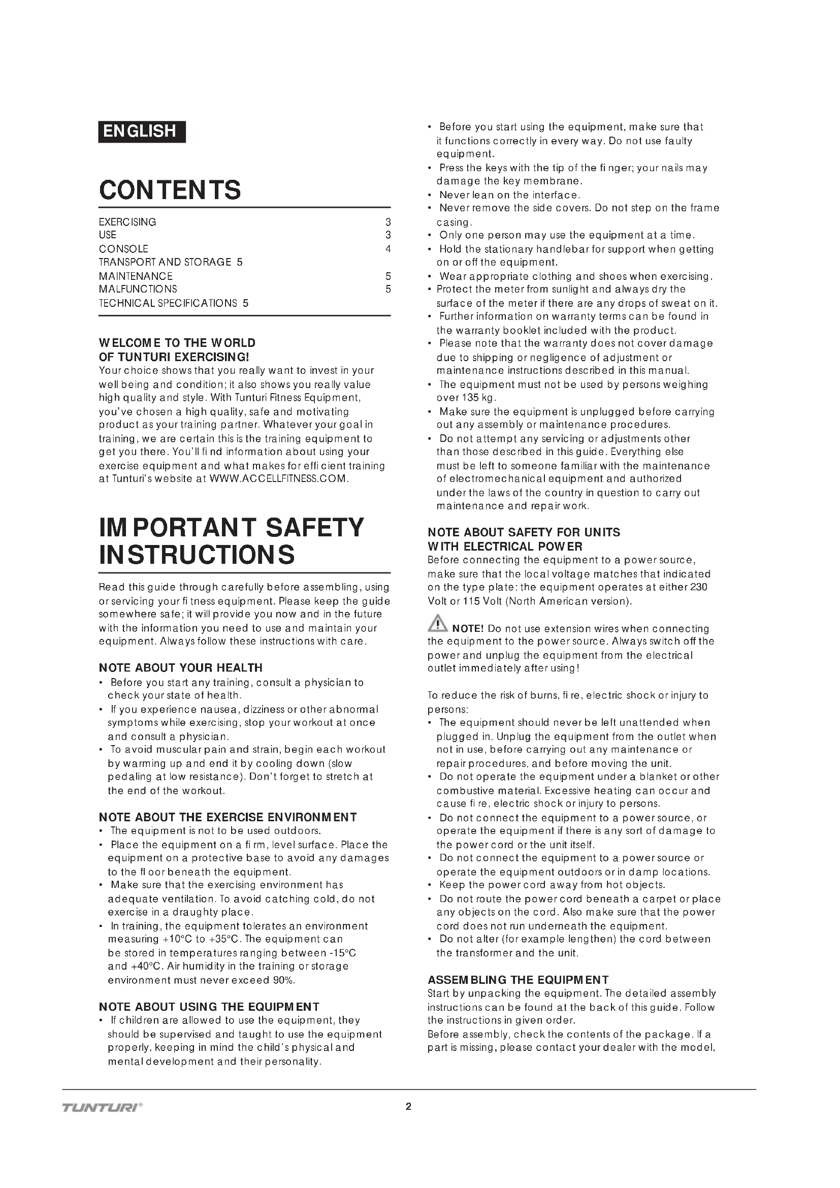 OF TUNTURI EXERCISING! Your choice shows that you really want to invest in your well being and condition; it also shows you really value high quality and style. With Tunturi Fitness Equipment, you’ve chosen a high quality, safe and motivating product as your training partner. Whatever your goal in training, we are certain this is the training equipment to get you there. You’ll fi nd information about using your exercise equipment and what makes for effi cient training at Tunturi’s website at WWW.ACCELLFITNESS.COM. IMPORTANT SAFETY INSTRUCTIONS Read this guide through carefully before assembling, using or servicing your fi tness equipment. Please keep the guide somewhere safe; it will provide you now and in the future with the information you need to use and maintain your equipment. Always follow these instructions with care.