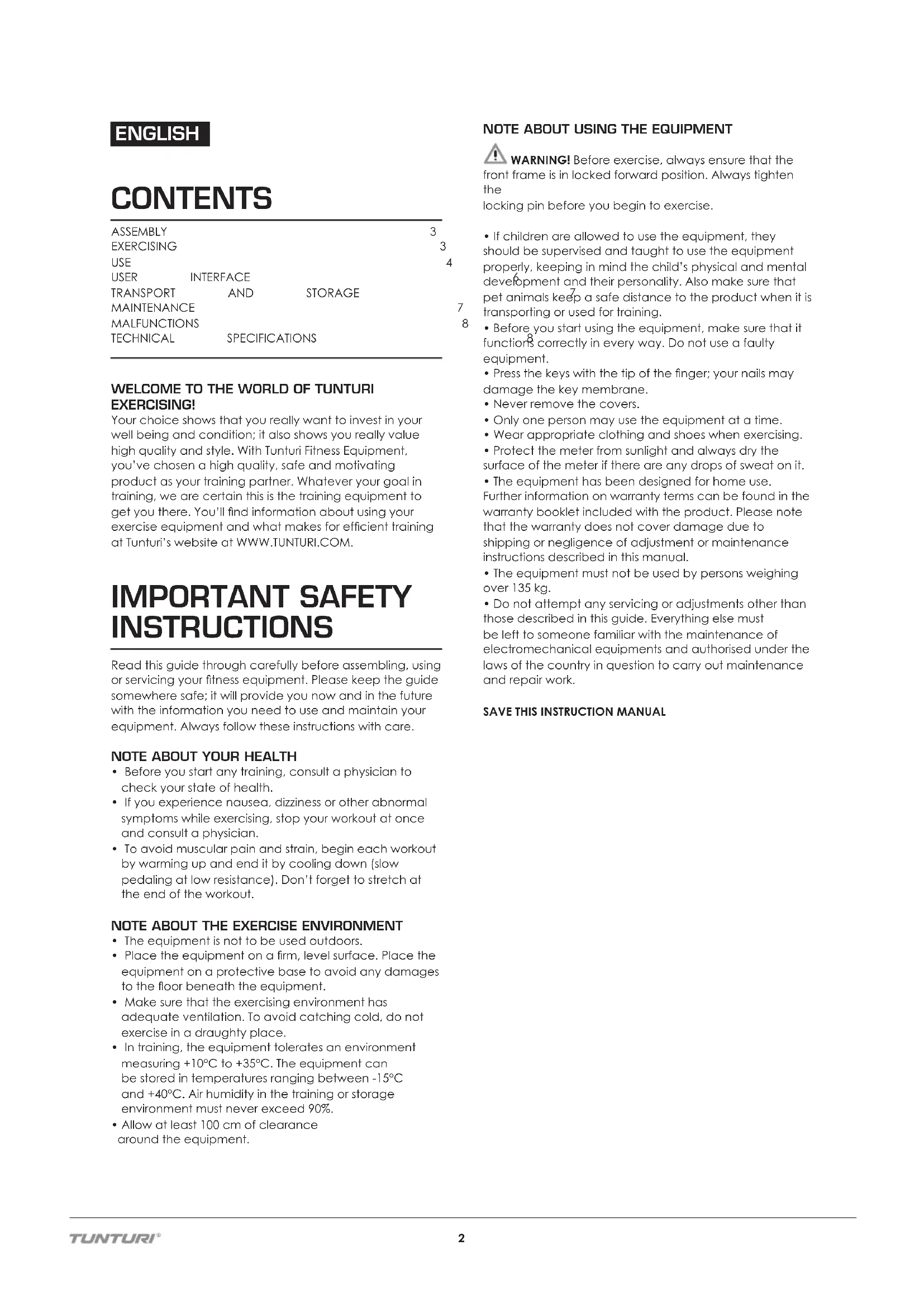 EXERCISING! Your choice shows that you really want to invest in your well being and condition; it also shows you really value high quality and style. With Tunturi Fitness Equipment, you’ve chosen a high quality, safe and motivating product as your training partner. Whatever your goal in training, we are certain this is the training equipment to get you there. You’ll nd information about using your exercise equipment and what makes for efcient training at Tunturi’s website at WWW.TUNTURI.COM. IMPORTANT SAFETY INSTRUCTIONS Read this guide through carefully before assembling, using or servicing your tness equipment. Please keep the guide somewhere safe; it will provide you now and in the future with the information you need to use and maintain your equipment. Always follow these instructions with care.