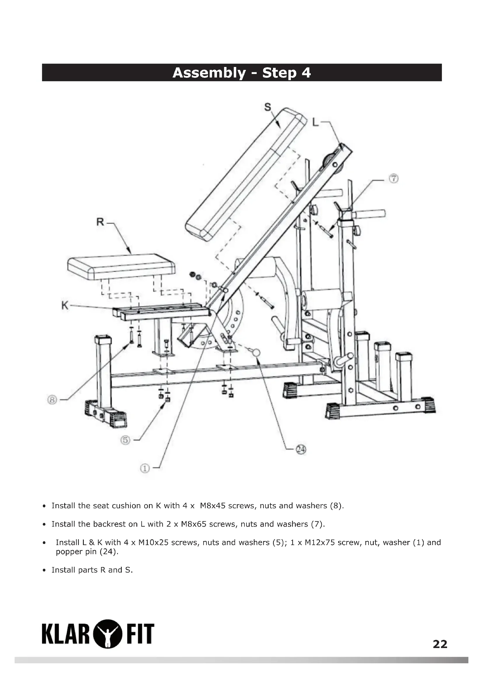 - Install the seat cushion on K with 4 × M8 × 45 screws, nuts and washers (8).