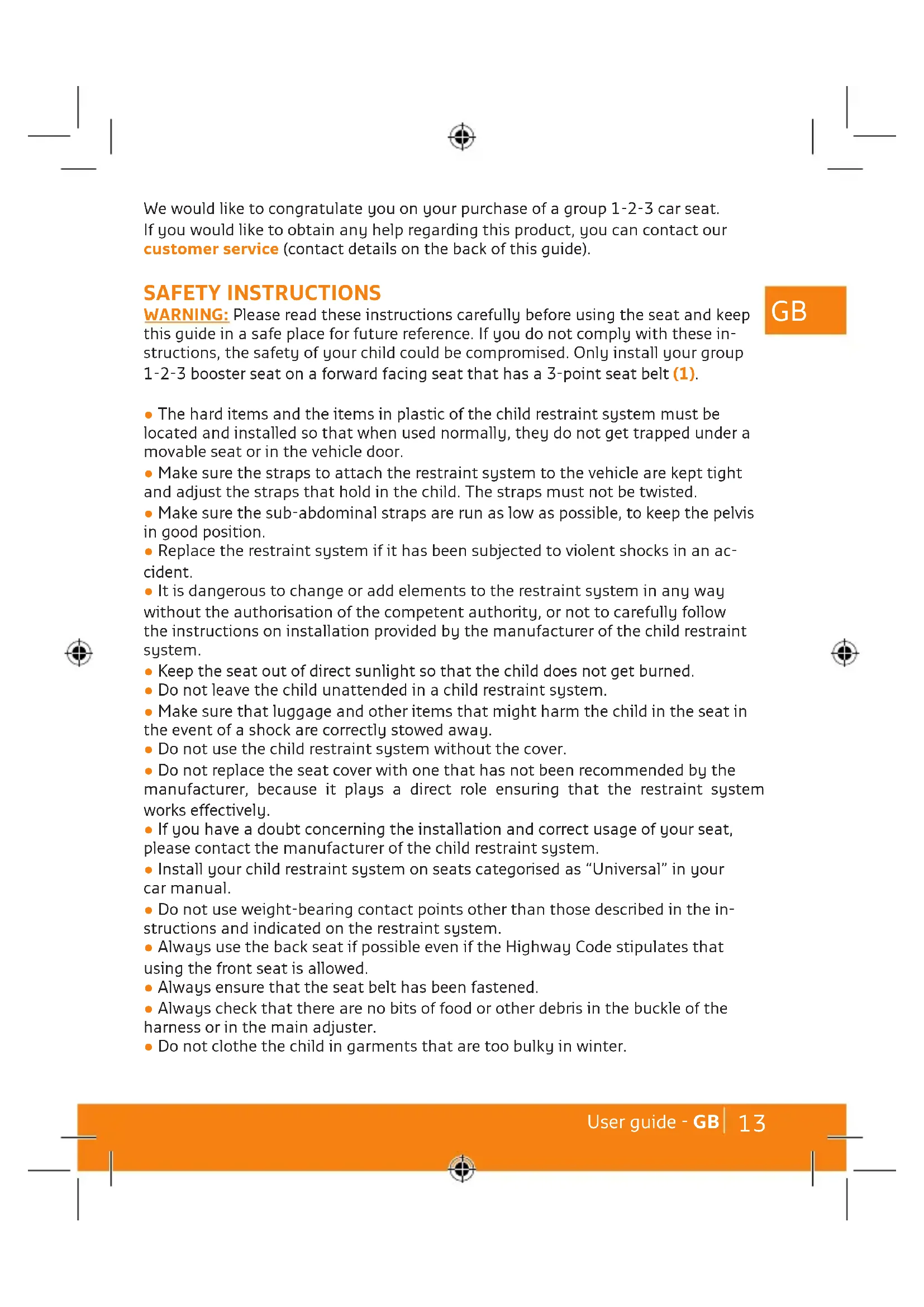 We would like to congratulate you on your purchase of a group 1-2-3 car seat. If you would like to obtain any help regarding this product, you can contact our customer service (contact details on the back of this guide). SAFETY INSTRUCTIONS