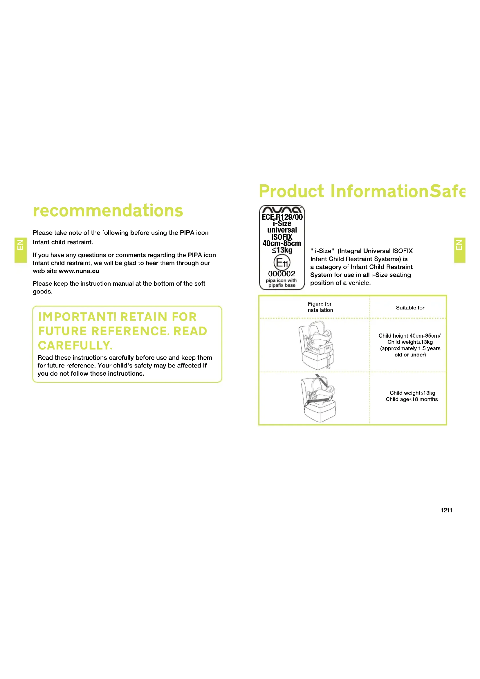 If you have any questions or comments regarding the PIPA icon Infant child restraint, we will be glad to hear them through our web site www.nuna.eu