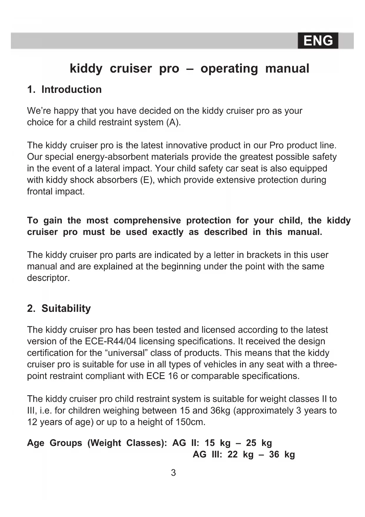 The kiddy cruiser pro has been tested and licensed according to the latest version of the ECE-R44/04 licensing specifications. It received the design certification for the “universal” class of products. This means that the kiddy cruiser pro is suitable for use in all types of vehicles in any seat with a three- point restraint compliant with ECE 16 or comparable specifications. The kiddy cruiser pro child restraint system is suitable for weight classes II to III, i.e. for children weighing between 15 and 36kg (approximately 3 years to 12 years of age) or up to a height of 150cm. Age Groups (Weight Classes): AG II: 15 kg – 25 kg AG III: 22 kg – 36 kg ENGFor use in your vehicle, please follow the manufacturer’s recommendations in your owner’s manual, or contact your dealership.