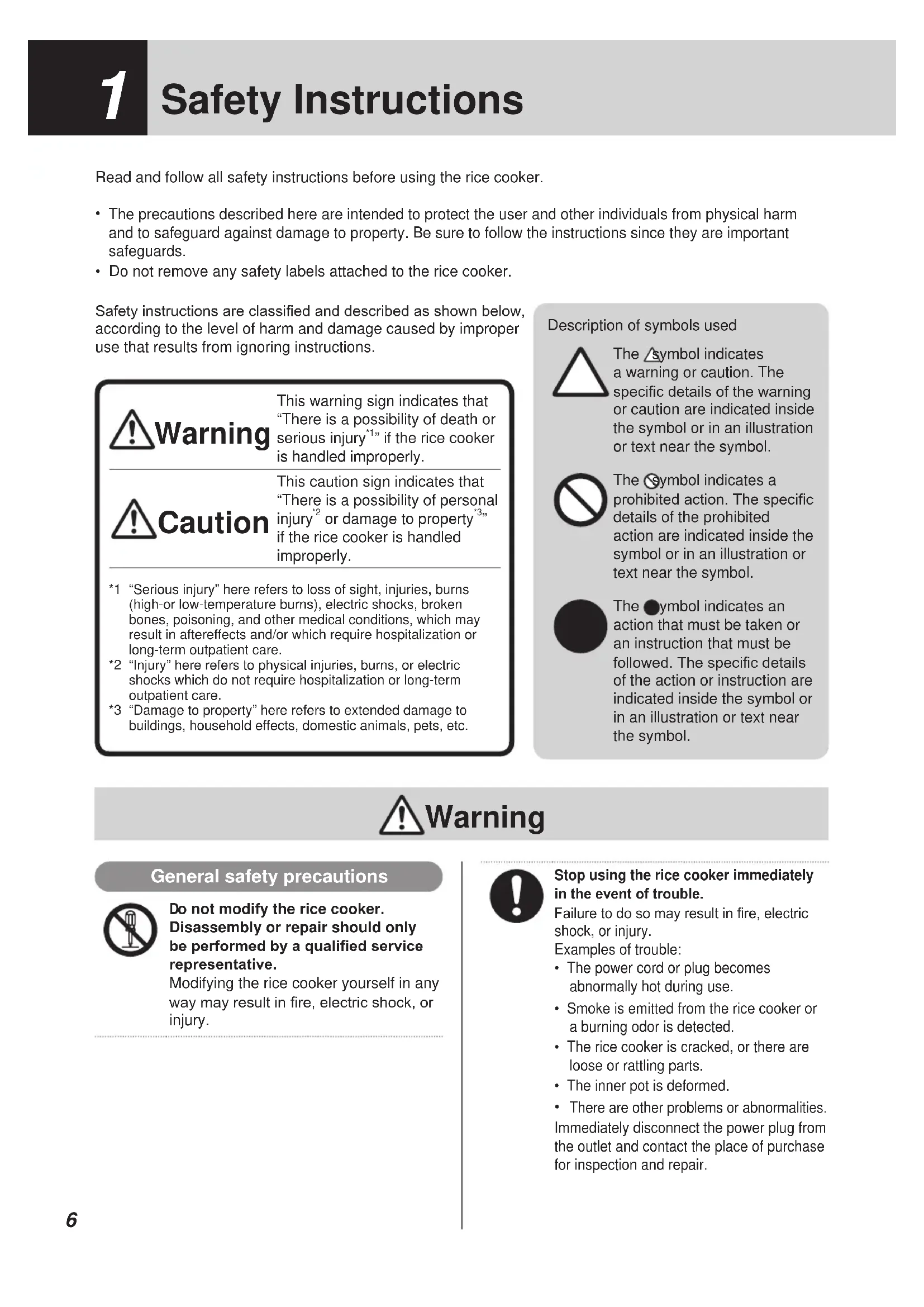 o not modify the rice cooker. Disassembly or repair should only be performed by a qualied service representative.Modifying the rice cooker yourself in any way may result in re, electric shock, or injury.Stop using the rice cooker immediately in the event of trouble.Failure to do so may result in re, electric shock, or injury.Examples of trouble:• The power cord or plug becomes abnormally hot during use.• Smoke is emitted from the rice cooker or a burning odor is detected.• The rice cooker is cracked, or there are loose or rattling parts.• The inner pot is deformed. There are other problems or abnormalities.Immediately disconnect the power plug from the outlet and contact the place of purchase for inspection and repair.Read and follow all safety instructions before using the rice cooker. The precautions described here are intended to protect the user and other individuals from physical harm and to safeguard against damage to property. Be sure to follow the instructions since they are important safeguards.• Do not remove any safety labels attached to the rice cooker.Safety instructions are classied and described as shown below, according to the level of harm and damage caused by improper use that results from ignoring instructions. Warning This warning sign indicates that “There is a possibility of death or serious injury ” if the rice cooker is handled improperly. Caution This caution sign indicates that “There is a possibility of personal injury or damage to property
