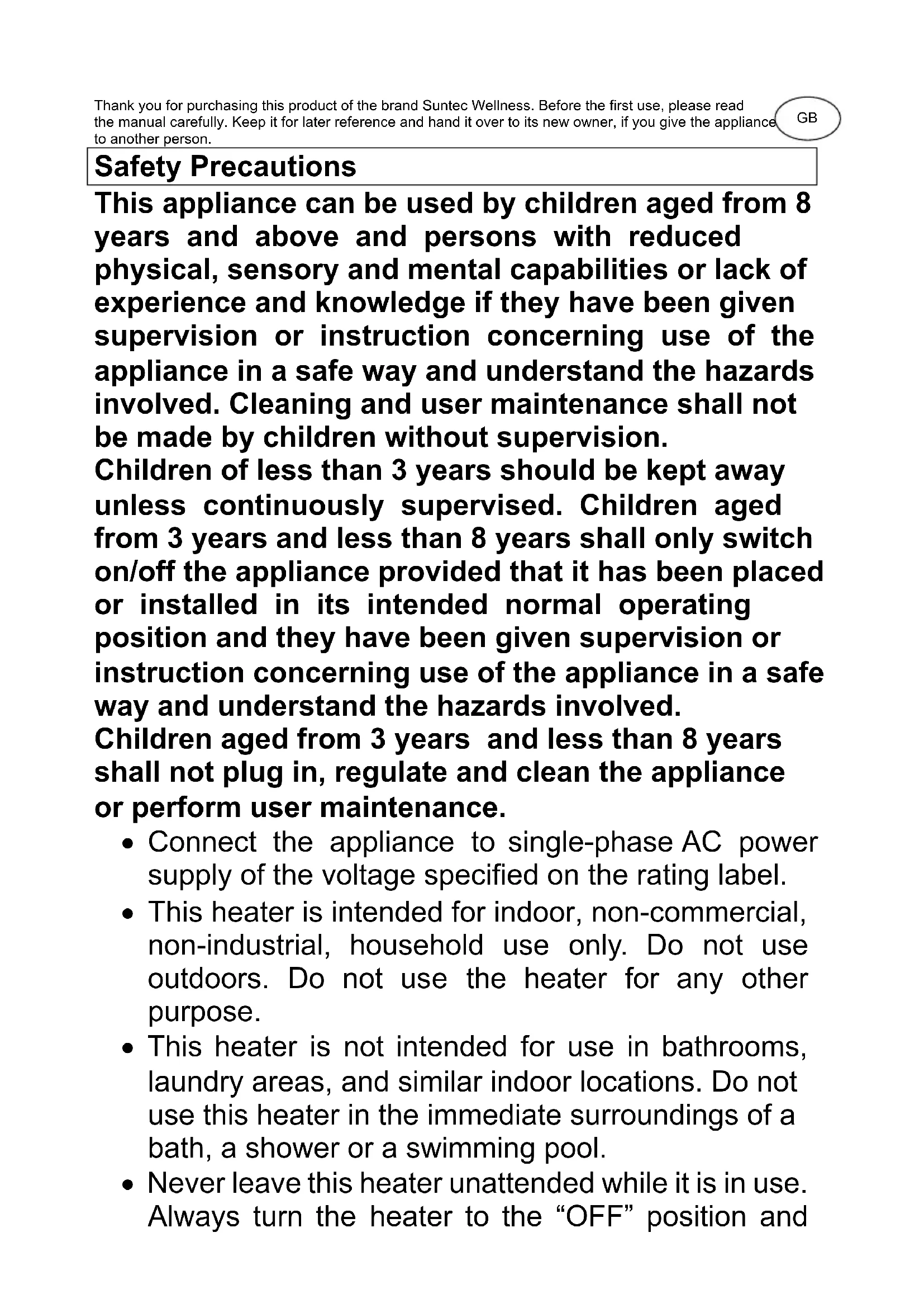 Heat Safe compact SUNTEC WELLNESS GMBH / HOLZSTRASSE 2 / 40 221 DÜSSELDORF / DEUTSCHLANDThank you for purchasing this product of the brand Suntec Wellness. Before the first use, please read the manual carefully. Keep it for later reference and hand it over to its new owner, if you give the appliance to another person. Safety Precautions This appliance can be used by children aged from 8 years and above and persons with reduced physical, sensory and mental capabilities or lack of experience and knowledge if they have been given supervision or instruction concerning use of the appliance in a safe way and understand the hazards involved. Cleaning and user maintenance shall not be made by children without supervision. Children of less than 3 years should be kept away unless continuously supervised. Children aged from 3 years and less than 8 years shall only switch on/off the appliance provided that it has been placed or installed in its intended normal operating position and they have been given supervision or instruction concerning use of the appliance in a safe way and understand the hazards involved. Children aged from 3 years and less than 8 years shall not plug in, regulate and clean the appliance or perform user maintenance.