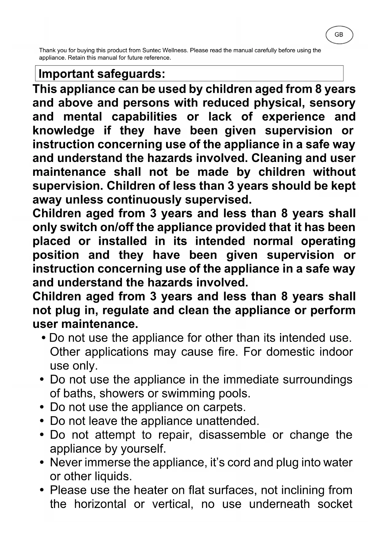 Thank you for buying this product from Suntec Wellness. Please read the manual carefully before using the appliance. Retain this manual for future reference. This appliance can be used by children aged from 8 years and above and persons with reduced physical, sensory and mental capabilities or lack of experience and knowledge if they have been given supervision or instruction concerning use of the appliance in a safe way and understand the hazards involved. Cleaning and user maintenance shall not be made by children without supervision. Children of less than 3 years should be kept away unless continuously supervised. Children aged from 3 years and less than 8 years shall only switch on/off the appliance provided that it has been placed or installed in its intended normal operating position and they have been given supervision or instruction concerning use of the appliance in a safe way and understand the hazards involved. Children aged from 3 years and less than 8 years shall not plug in, regulate and clean the appliance or perform user maintenance.