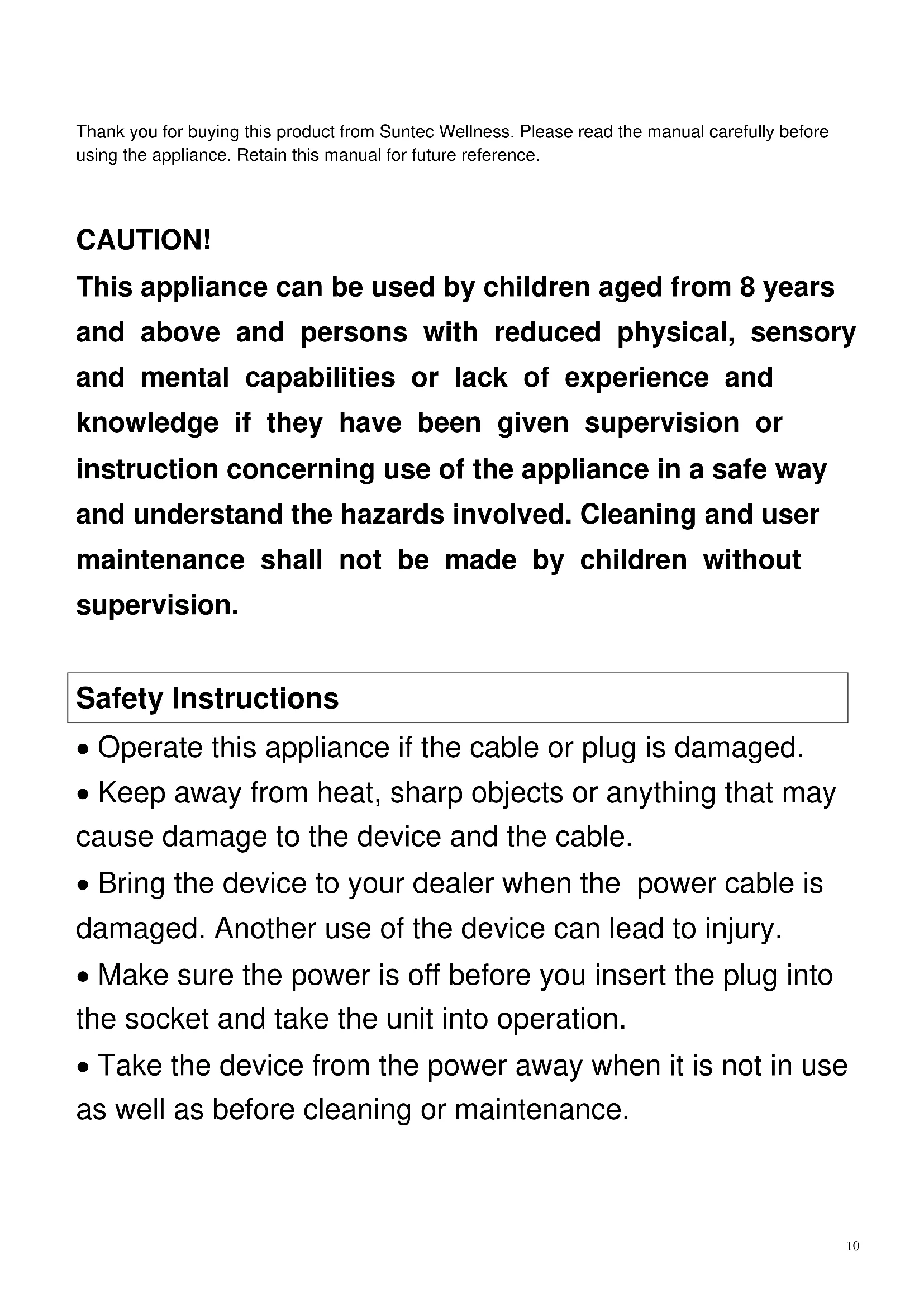 Thank you for buying this product from Suntec Wellness. Please read the manual carefully before using the appliance. Retain this manual for future reference. CAUTION! This appliance can be used by children aged from 8 years and above and persons with reduced physical, sensory and mental capabilities or lack of experience and knowledge if they have been given supervision or instruction concerning use of the appliance in a safe way and understand the hazards involved. Cleaning and user maintenance shall not be made by children without supervision. Safety Instructions Operate this appliance if the cable or plug is damaged. Keep away from heat, sharp objects or anything that may cause damage to the device and the cable. Bring the device to your dealer when the power cable is damaged. Another use of the device can lead to injury. Make sure the power is off before you insert the plug into the socket and take the unit into operation. Take the device from the power away when it is not in use as well as before cleaning or maintenance.11 Move the main switch in the OFF position before removing the plug from the socket. Do not pull the power cord, but on the plug. The heater must not stand directly under a wall socket. Do not use and store the unit near gasoline, paint or flammable liquids. The device is only suitable for outdoor use. Any other use which is not recommended by the manufacturer may cause fire, electric shock, personal injury or property damage. The device is intended for household use. Please operate the unit at construction sites, in greenhouses, barns or stables. Please do not use the appliance as a room heater. To avoid overheating, never cover the heater off please. To prevent a possible fire, keep air inlets and outlets freely. The device should be on a flat, level surface, 150 cm away from other objects. Do not touch the hot surfaces. Do not Insert foreign material in the ventilation or suction as this may result in electric shock, fire or damage to the unit. Please do not touch the unit, the power cord and the power plug with wet hands. Please do not leave the device during commissioning unattended.12 The most common cause of overheating is deposits of dust or lint in the machine. Make sure that these deposits are removed regularly, by turning off the device and vacuum with the vacuum cleaner air vents and grids. Please do not put the heater on carpets and do not place the cable under the carpet. Make sure that the cable is not in a way positioned that you could trip over. Do not use this heater in the immediate vicinity of bathtubs, showers or swimming pools. The device must not be operated in a sauna. Store the device in a cool, clean and free from environmental influences place Do not use the device with a programmer, timer or any other device that uses the heater automatically or turn it on or off, in order to avoid the risk of fire Please, do not wrap the cable around the device. Please keep the product away from places, where draft and / or corrosive substances are exposed. Please do not use the appliance as a towel or dryer. Please do not operate the device in animal breeding stations etc. Please keep the device away from other heating or other hot air sources. Please do not put the appliance in water.13 The surface of the unit remains during operation and for some time after switching off hot. Please take care to avoid burns. The product must not be exposed to vibration or shock. Please use the device with caution. The device may only be operated connected to ground. Please keep the device away from flammable materials. Please allow the unit to cool completely before you clean or move it. Important: This heater is equipped with a temperature control unit. Please do not operate the unit near people who cannot move independently be, unless they are supervised throughout.