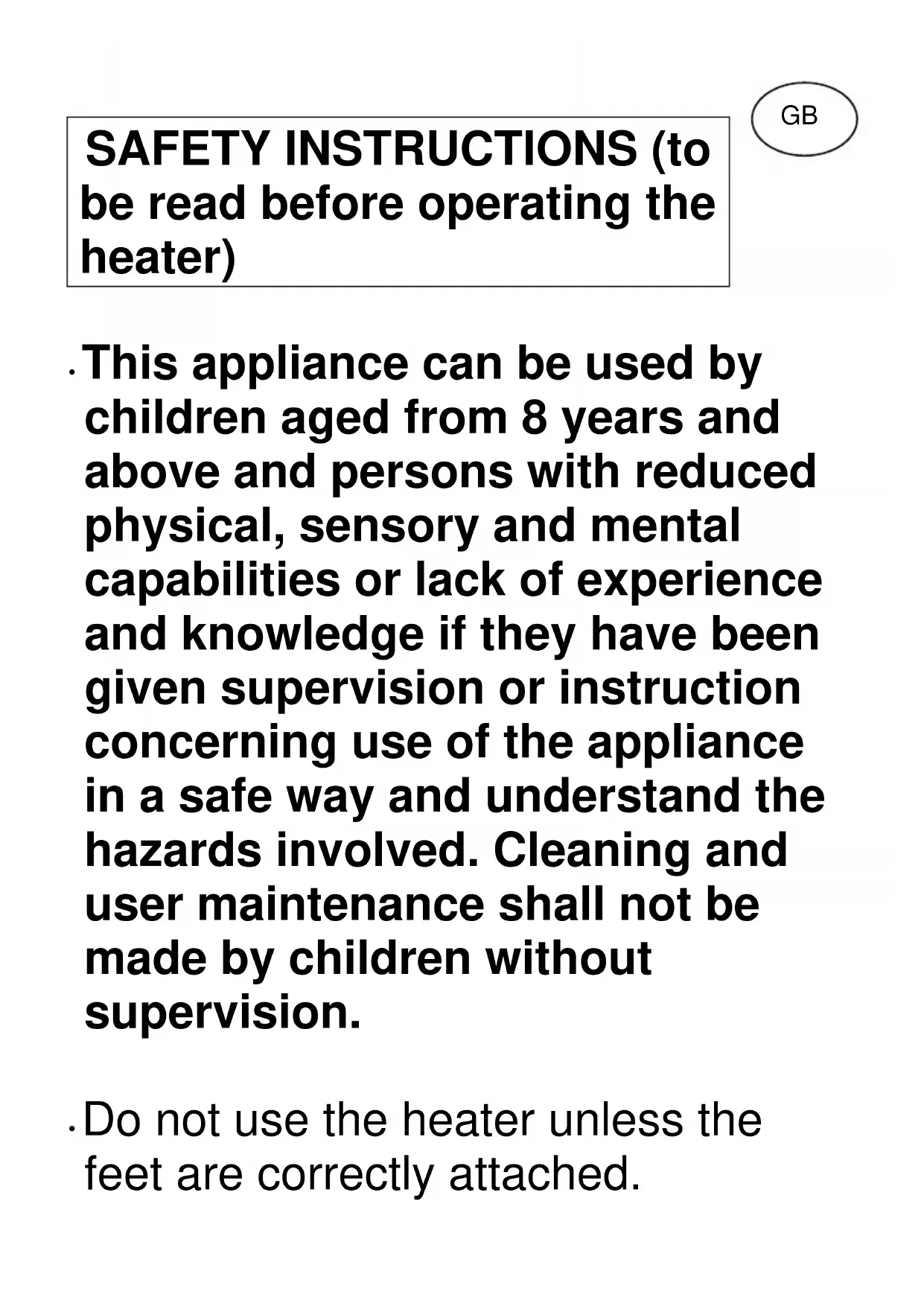 This appliance can be used by children aged from 8 years and above and persons with reduced physical, sensory and mental capabilities or lack of experience and knowledge if they have been given supervision or instruction concerning use of the appliance in a safe way and understand the hazards involved. Cleaning and user maintenance shall not be made by children without supervision. Do not use the heater unless the feet are correctly attached. GB Ensure the power supply to the socket into which the heater is plugged is in accordance with the rating label on the heater and that the socket is earthed. Keep the mains lead away from the hot body of the heater. The heater is not intended for use in bathrooms, laundry areas or similar indoor locations. Never place the heater where it may fall into a bathtub or other water container. Do not use outdoors. Do not cover or obstruct any of the heat outlet grilles or the air intake openings of the heater. Do not place the heater on carpets having a very deep pile. Always ensure that the heater is placed on a firm level surface. Ensure that the heater is notpositioned close to curtains or furniture as this could create a fire hazard. Do not position the heater in front of, or immediately below, a wall socket. Do not insert any object through the heat outlet or air intake grilles of the heater. Do not use the heater in areas where flammable liquids are stored or where flammable fumes may be present. Particular care should be taken when the heater is situated in areas occupied by children or invalids. Always unplug the heater when moving it from one location to another. Do not use the heater if the power cord is damaged. If the power cord is damaged, it must be replaced by arecognized service agent or other qualified person. If the plug is damaged, see Plug Replacement details below. TECHINICAL CHARACTERISTICS HEAT FLOW 2000 - Convector heater with thermostat. HEAT FLOW 2010 - Convector heater with thermostat and timer. HEAT FLOW 2020 - Convector heater with thermostat and fan. HEAT FLOW 2050 - Convector heater with thermostat, timer and fan. MAX.POWER: 2000-2200W/ POWER RANGE: 700-1250-2000W/ MOTOR POWER: 20W/ VOLTAGE: 230V~50Hz IMPORTANT Read these instructions fully before using the heater. Retain these instructions for future reference. This appliance is not intended for use by persons (including children) with reduced physical, sensory or mental capabilities, or lack of experience and knowledge, unless they have been given supervision or instruction concerning use of the appliance by a person responsible for their safety. Children should be supervised to ensure that they do not play with the appliance.