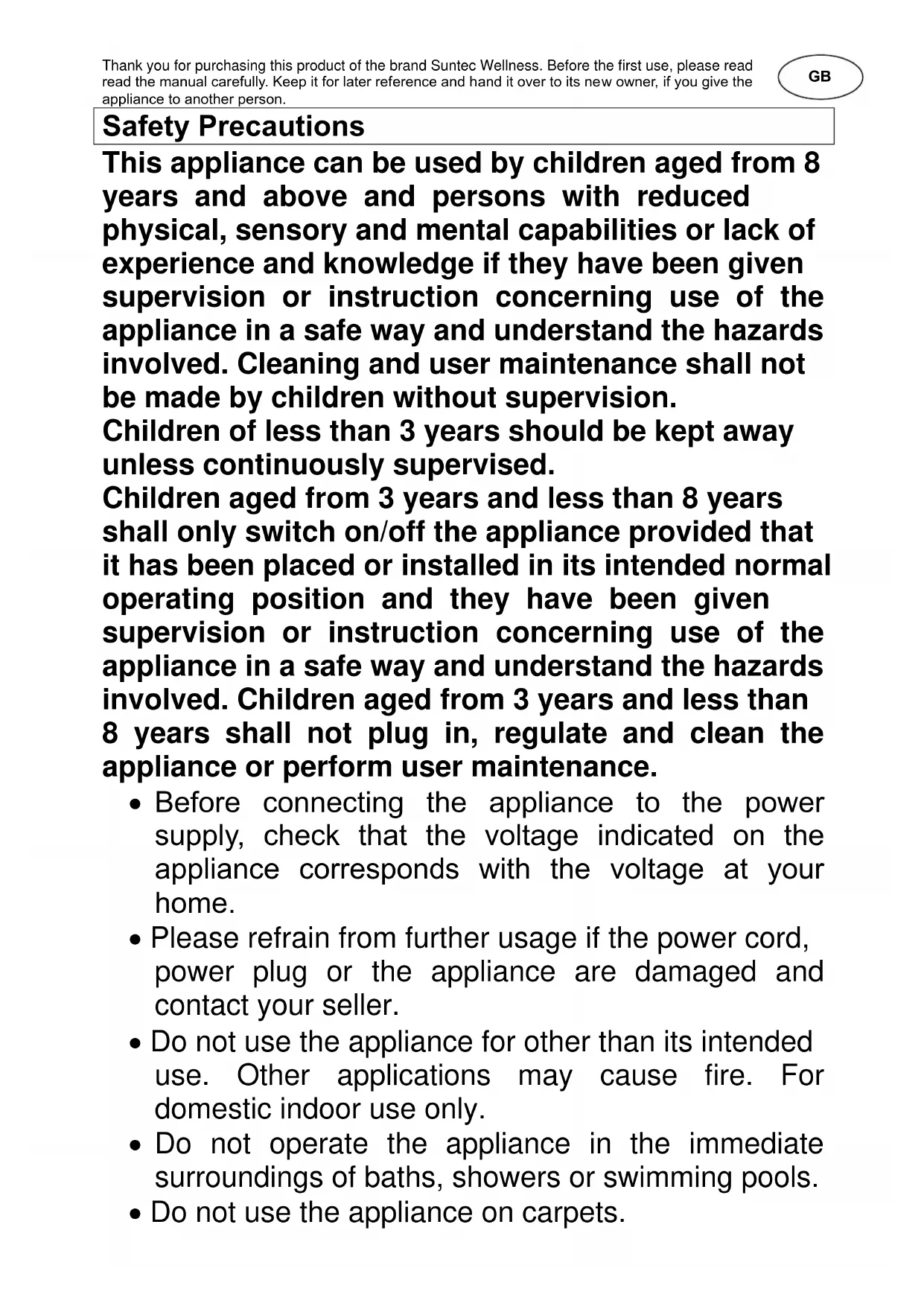 Heat Block PTC SUNTEC WELLNESS GMBH / HOLZSTRASSE 2 / 40221 DÜSSELDORF / GERMANYThank you for purchasing this product of the brand Suntec Wellness. Before the first use, please read read the manual carefully. Keep it for later reference and hand it over to its new owner, if you give the appliance to another person. Safety Precautions This appliance can be used by children aged from 8 years and above and persons with reduced physical, sensory and mental capabilities or lack of experience and knowledge if they have been given supervision or instruction concerning use of the appliance in a safe way and understand the hazards involved. Cleaning and user maintenance shall not be made by children without supervision. Children of less than 3 years should be kept away unless continuously supervised. Children aged from 3 years and less than 8 years shall only switch on/off the appliance provided that it has been placed or installed in its intended normal operating position and they have been given supervision or instruction concerning use of the appliance in a safe way and understand the hazards involved. Children aged from 3 years and less than 8 years shall not plug in, regulate and clean the appliance or perform user maintenance.