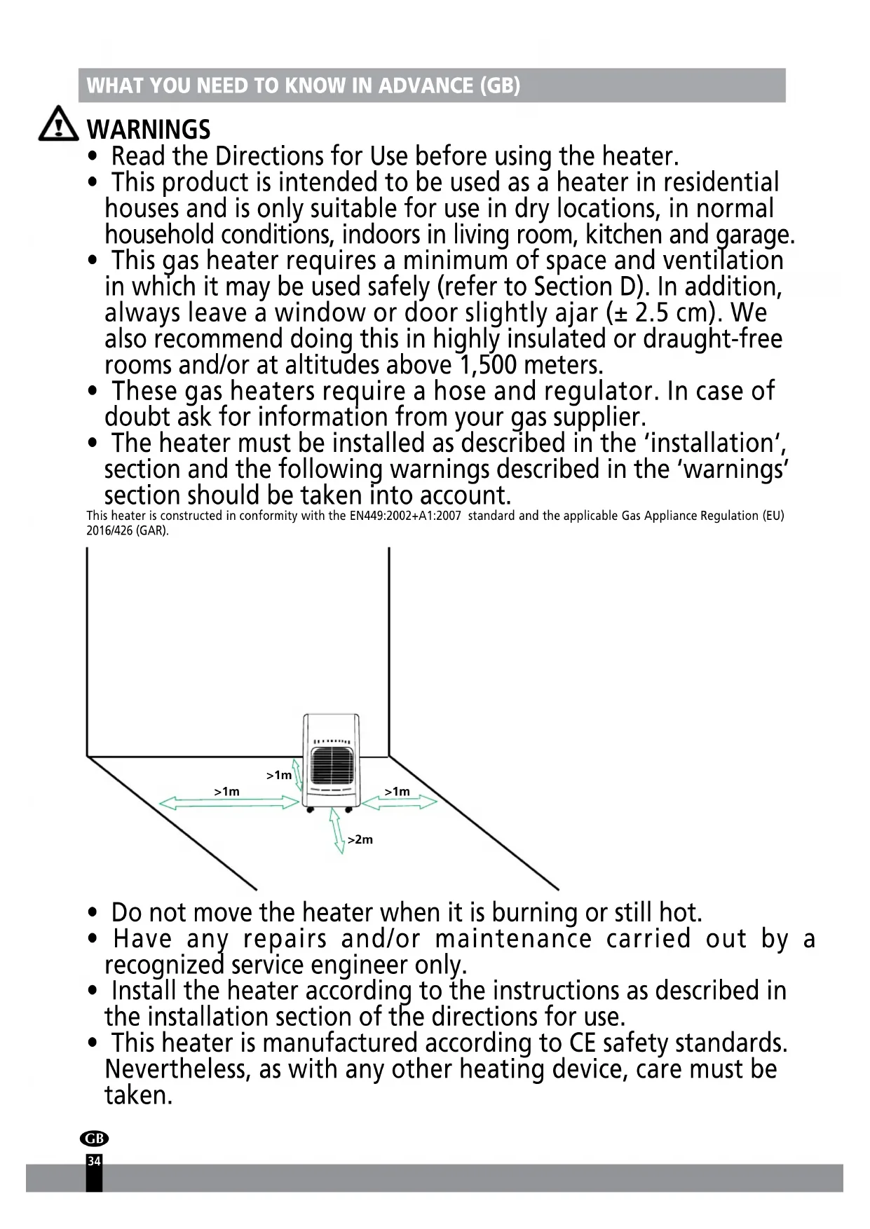 - This gas heater requires a minimum of space and ventilation in which it may be used safely (refer to Section D). In addition, always leave a window or door slightly ajar (± 2.5 cm). We also recommend doing this in highly insulated or draught-free rooms and/or at altitudes above 1,500 meters.