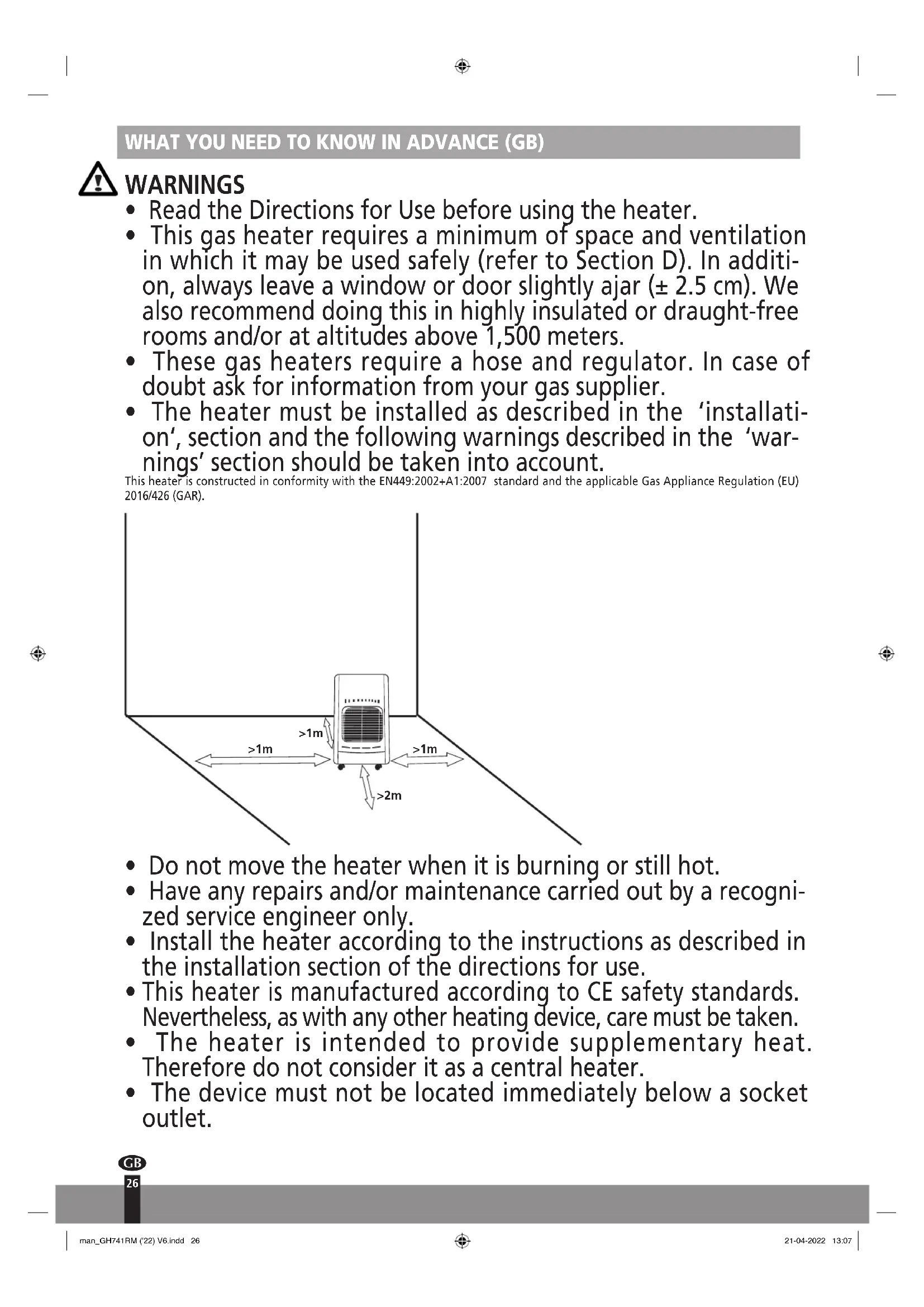- The heater must be installed as described in the ‘installati- on‘, section and the following warnings described in the ‘war- nings’ section should be taken into account. This heater is constructed in conformity with the EN449:2002+A1:2007 standard and the applicable Gas Appliance Regulation (EU) 2016/426 (GAR).