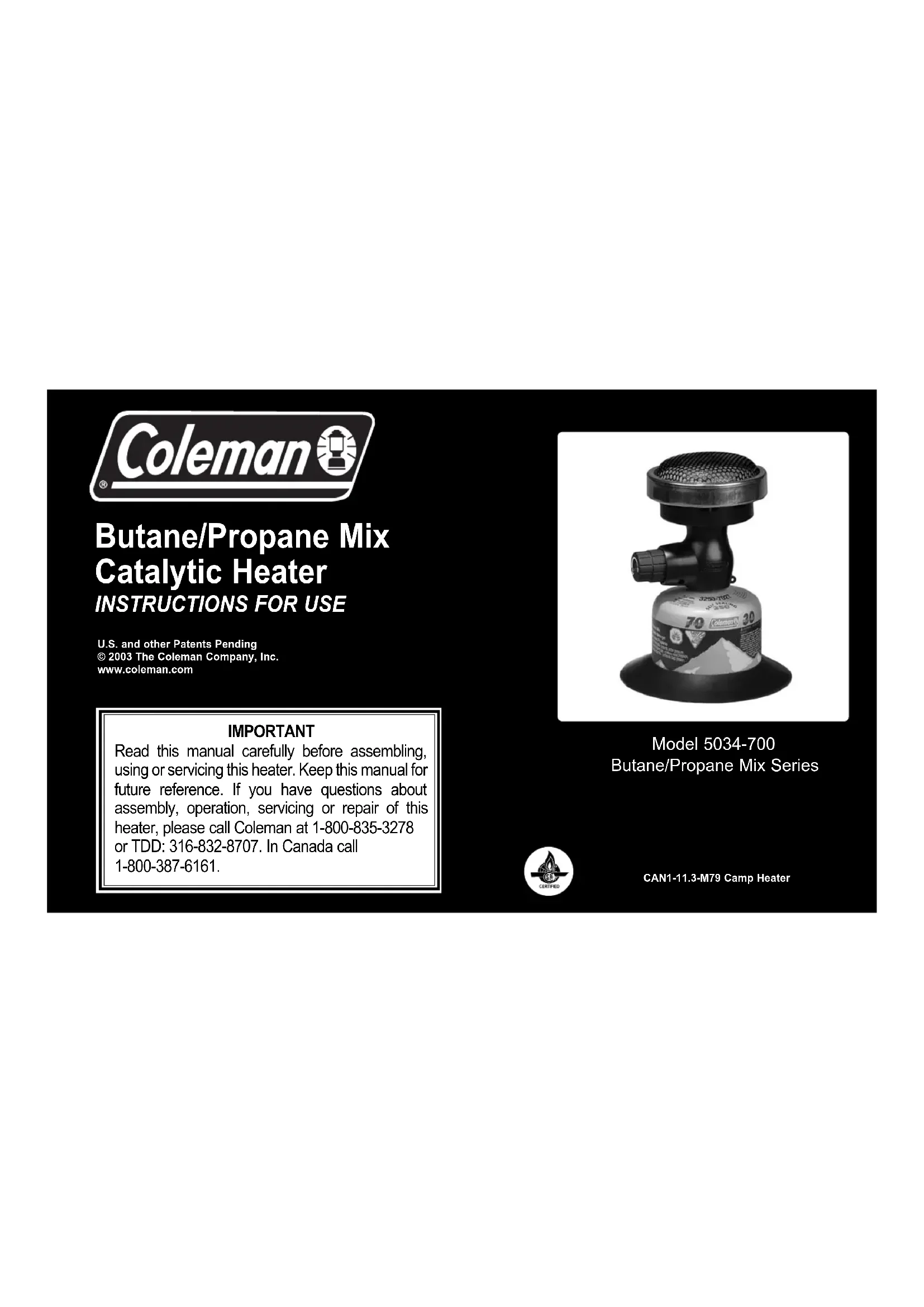 Model 5034-700 Butane/Propane Mix Series CAN1-11.3-M79 Camp Heater U.S. and other Patents Pending © 2003 The Coleman Company, Inc. www.coleman.com IMPORTANT Read this manual carefully before assembling, using or servicing this heater. Keep this manual for future reference. If you have questions about assembly, operation, servicing or repair of this heater, please call Coleman at 1-800-835-3278 or TDD: 316-832-8707. In Canada call 1-800-387-6161.2 Contents General Safety Information To Set Up To Light To Tur n Off To Store Things You Should Know Replacement Parts List Warranty This manual contains important information about the assembly, operation and maintenance of this heater. General safety information is presented in these first few pages and is also located throughout the manual. Particular attention should be paid to information accompanied by the safety alert symbol “ DANGER”, “ WARNING”, “ CAUTION”. Keep this manual for future reference and to educate new users of this product. This manual should be read in conjunction with the labeling on the product. Safety precautions are essential when any mechanical or LPG (liquefied petroleum gas) equipment is involved. These precautions are necessary when using, storing, and servicing. Using this equipment with the respect and caution demanded will reduce the possibilities of personal injury or property damage. The following symbols shown below are used extensively throughout this manual. Always heed these precautions, as they are essential when using any mechanical or propane fueled equipment. General Safety Information Warning