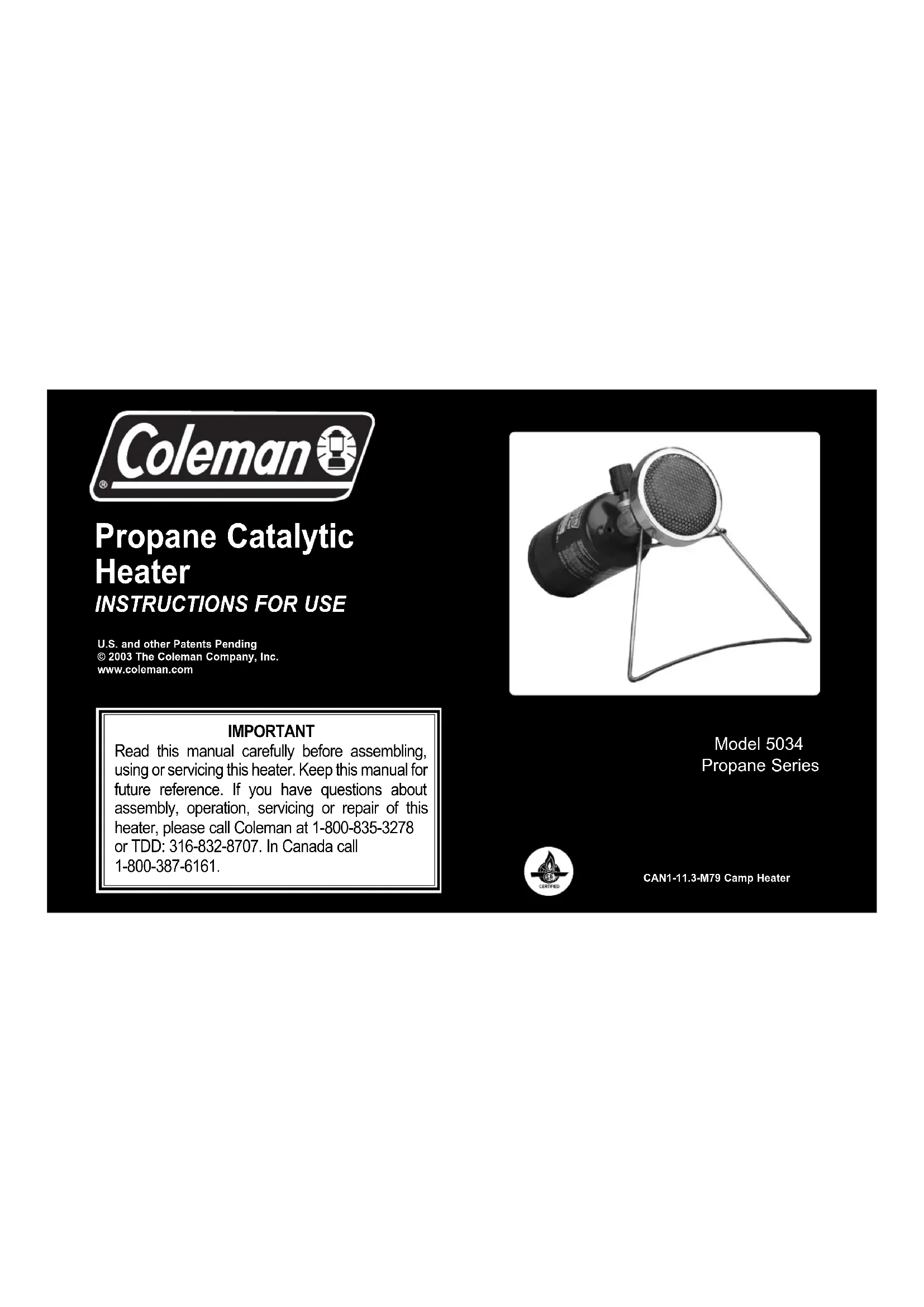 Model 5034 Propane Series CAN1-11.3-M79 Camp Heater U.S. and other Patents Pending © 2003 The Coleman Company, Inc. www.coleman.com IMPORTANT Read this manual carefully before assembling, using or servicing this heater. Keep this manual for future reference. If you have questions about assembly, operation, servicing or repair of this heater, please call Coleman at 1-800-835-3278 or TDD: 316-832-8707. In Canada call 1-800-387-6161.2 Contents General Safety Information To Set Up To Light To Tur n Off To Store Things You Should Know Replacement Parts List Warranty This manual contains important information about the assembly, operation and maintenance of this heater. General safety information is presented in these first few pages and is also located throughout the manual. Particular attention should be paid to information accompanied by the safety alert symbol “ DANGER”, “ WARNING”, “ CAUTION”. Keep this manual for future reference and to educate new users of this product. This manual should be read in conjunction with the labeling on the product. Safety precautions are essential when any mechanical or propane fueled equipment is involved. These precautions are necessary when using, storing, and servicing. Using this equipment with the respect and caution demanded will reduce the possibilities of personal injury or property damage. The following symbols shown below are used extensively throughout this manual. Always heed these precautions, as they are essential when using any mechanical or propane fueled equipment. General Safety Information Warning