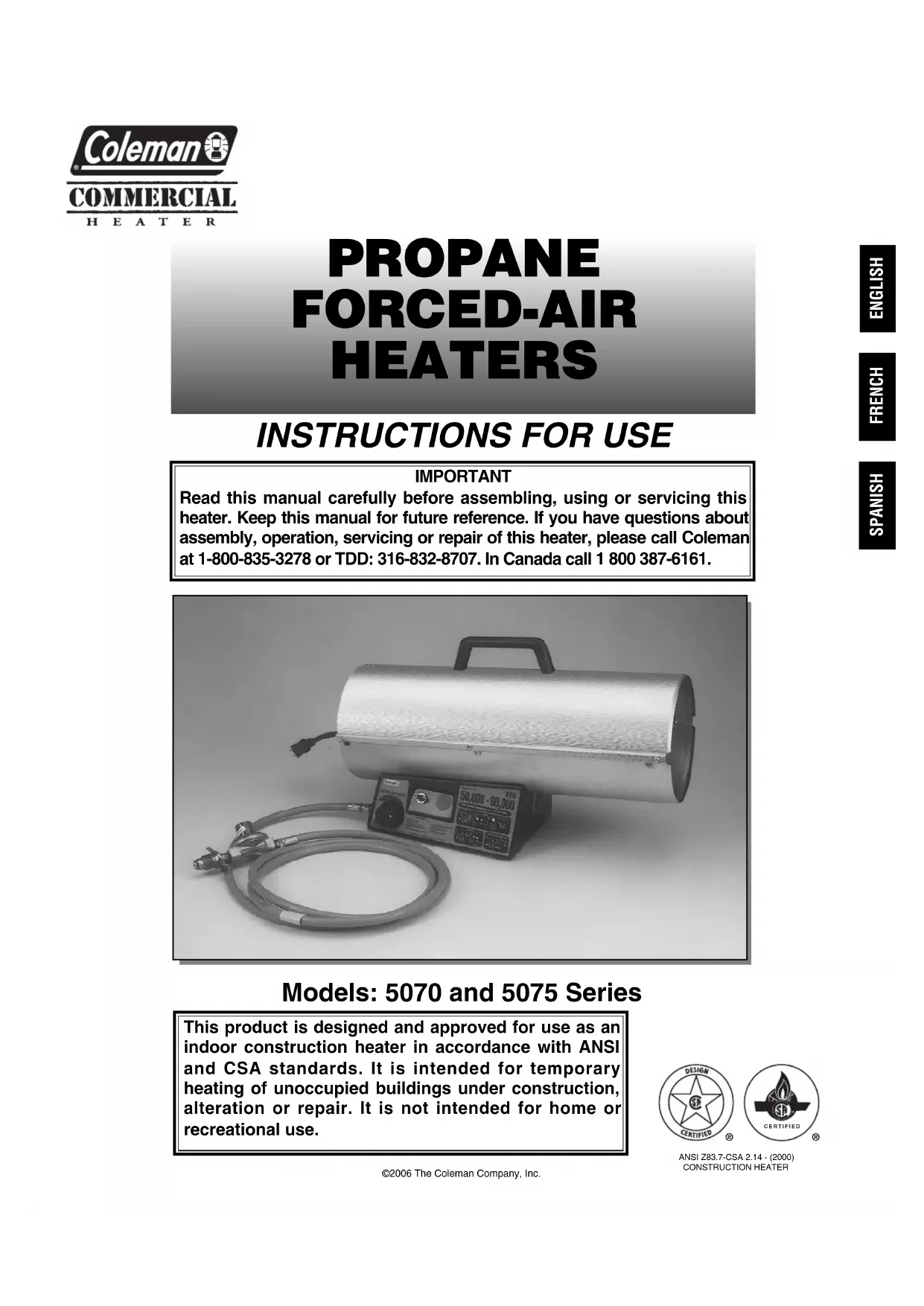 IMPORTANT Read this manual carefully before assembling, using or servicing this heater. Keep this manual for future reference. If you have questions about assembly, operation, servicing or repair of this heater, please call Coleman at 1-800-835-3278 or TDD: 316-832-8707. In Canada call 1 800 387-6161. This product is designed and approved for use as an indoor construction heater in accordance with ANSI and CSA standards. It is intended for temporary heating of unoccupied buildings under construction, alteration or repair. It is not intended for home or recreational use. CERTIFIED