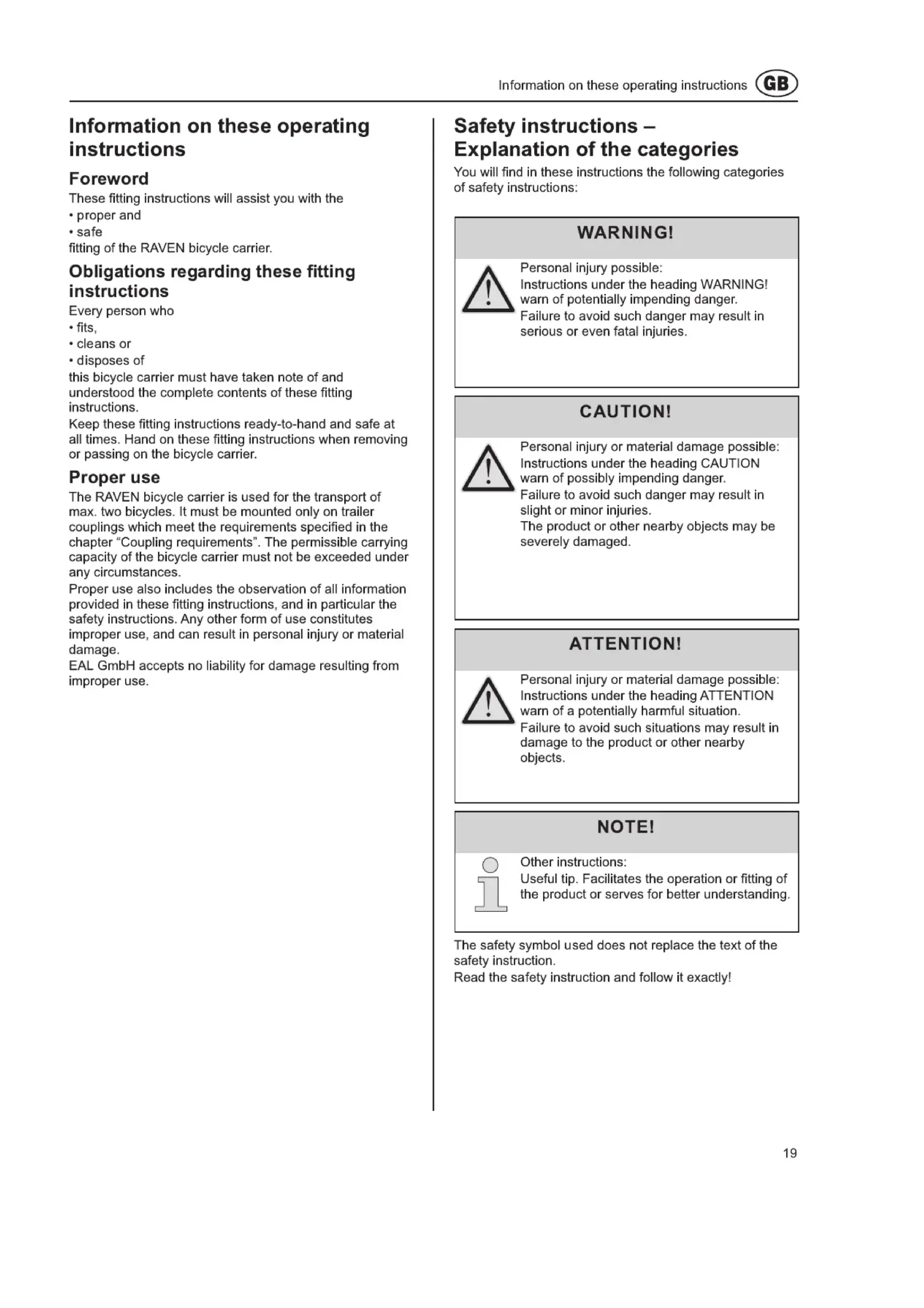 - disposes of this bicycle carrier must have taken note of and understood the complete contents of these fitting instructions. Keep these fitting instructions ready-to-hand and safe at all times. Hand on these fitting instructions when removing or passing on the bicycle carrier. Proper use The RAVEN bicycle carrier is used for the transport of max. two bicycles. It must be mounted only on trailer couplings which meet the requirements specified in the chapter “Coupling requirements”. The permissible carrying capacity of the bicycle carrier must not be exceeded under any circumstances. Proper use also includes the observation of all information provided in these fitting instructions, and in particular the safety instructions. Any other form of use constitutes improper use, and can result in personal injury or material damage. EAL GmbH accepts no liability for damage resulting from improper use.20 WARNING! Personal injury or material damage due to loss of the bicycles. Carrying bicycles without using the safety straps can lead to accidents.