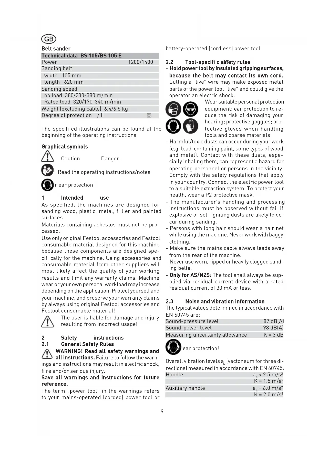 - Hold power tool by insulated gripping surfaces, because the belt may contact its own cord. Cutting a “live” wire may make exposed metal parts of the power tool “live” and could give the operator an electric shock. Wear suitable personal protection equipment: ear protection to re- duce the risk of damaging your hearing; protective goggles; pro- tective gloves when handling tools and coarse materials - Harmful/toxic dusts can occur during your work (e.g. lead-containing paint, some types of wood and metal). Contact with these dusts, espe- cially inhaling them, can represent a hazard for operating personnel or persons in the vicinity. Comply with the safety regulations that apply in your country. Connect the electric power tool to a suitable extraction system. To protect your health, wear a P2 protective mask. - The manufacturer’s handling and processing instructions must be observed without fail if explosive or self-igniting dusts are likely to oc- cur during sanding. - Persons with long hair should wear a hair net while using the machine. Never work with baggy clothing. - Make sure the mains cable always leads away from the rear of the machine. - Never use worn, ripped or heavily clogged sand- ing belts. - Only for AS/NZS: The tool shall always be sup- plied via residual current device with a rated residual current of 30 mA or less.