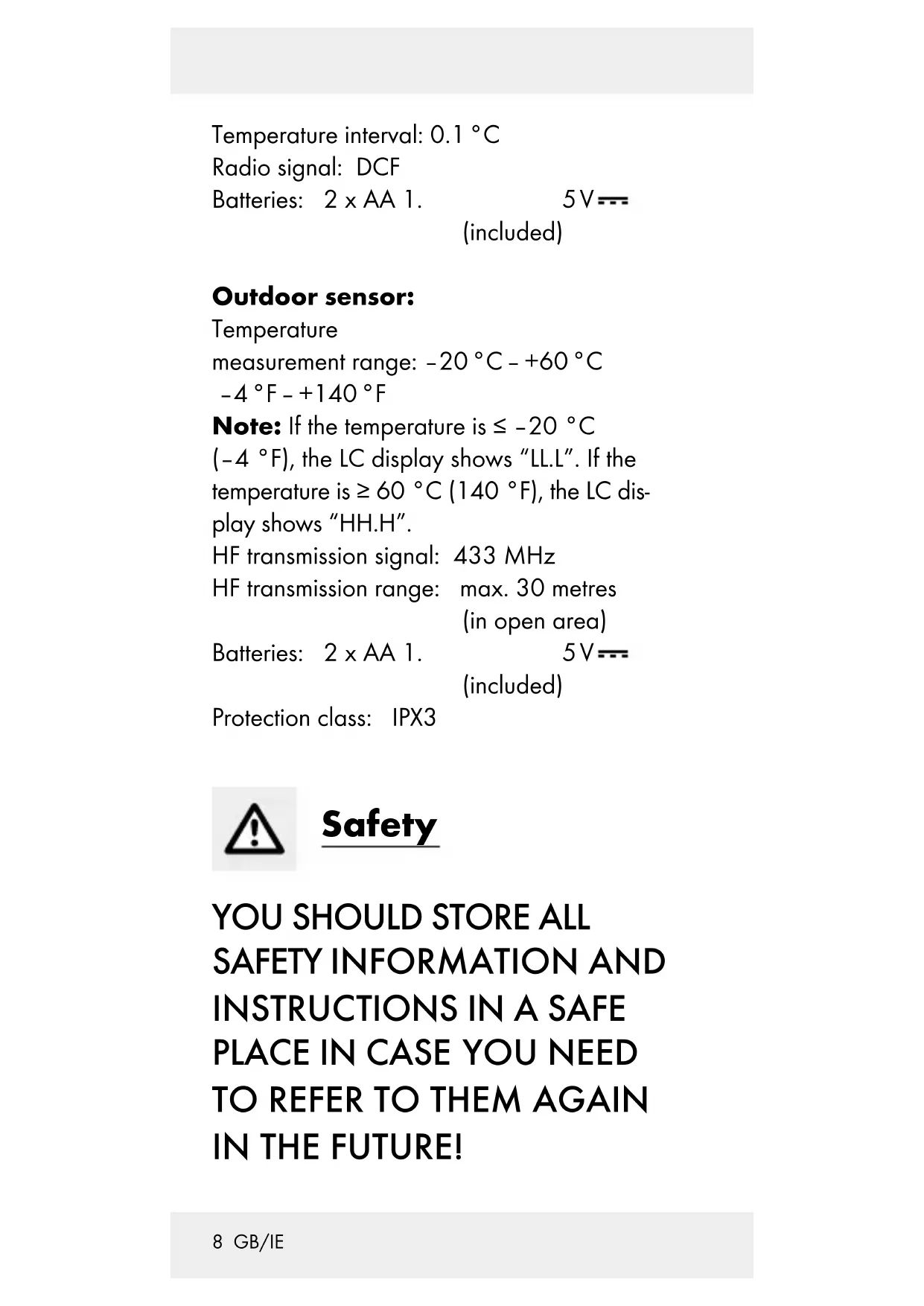 Technical data Temperature station: Temperature measurement range: 0 – + 50 °C +32 – +122 °F Note: If the temperature is ≤0 °C (32 °F), the LC display shows “LL.L”. If the temperature is ≥50 °C (122 °F), the LC display shows “HH.H”.8 GB/IE Temperature interval: 0.1 °C Radio signal: DCF Batteries: 2 x AA 1. 5 V (included) Outdoor sensor: Temperature measurement range: –20 °C – +60 °C –4 °F – +140 °F Note: If the temperature is ≤–20 °C (–4 °F), the LC display shows “LL.L”. If the temperature is ≥60 °C (140 °F), the LC dis- play shows “HH.H”. HF transmission signal: 433 MHz HF transmission range: max. 30 metres (in open area) Batteries: 2 x AA 1. 5 V (included) Protection class: IPX3 Safety