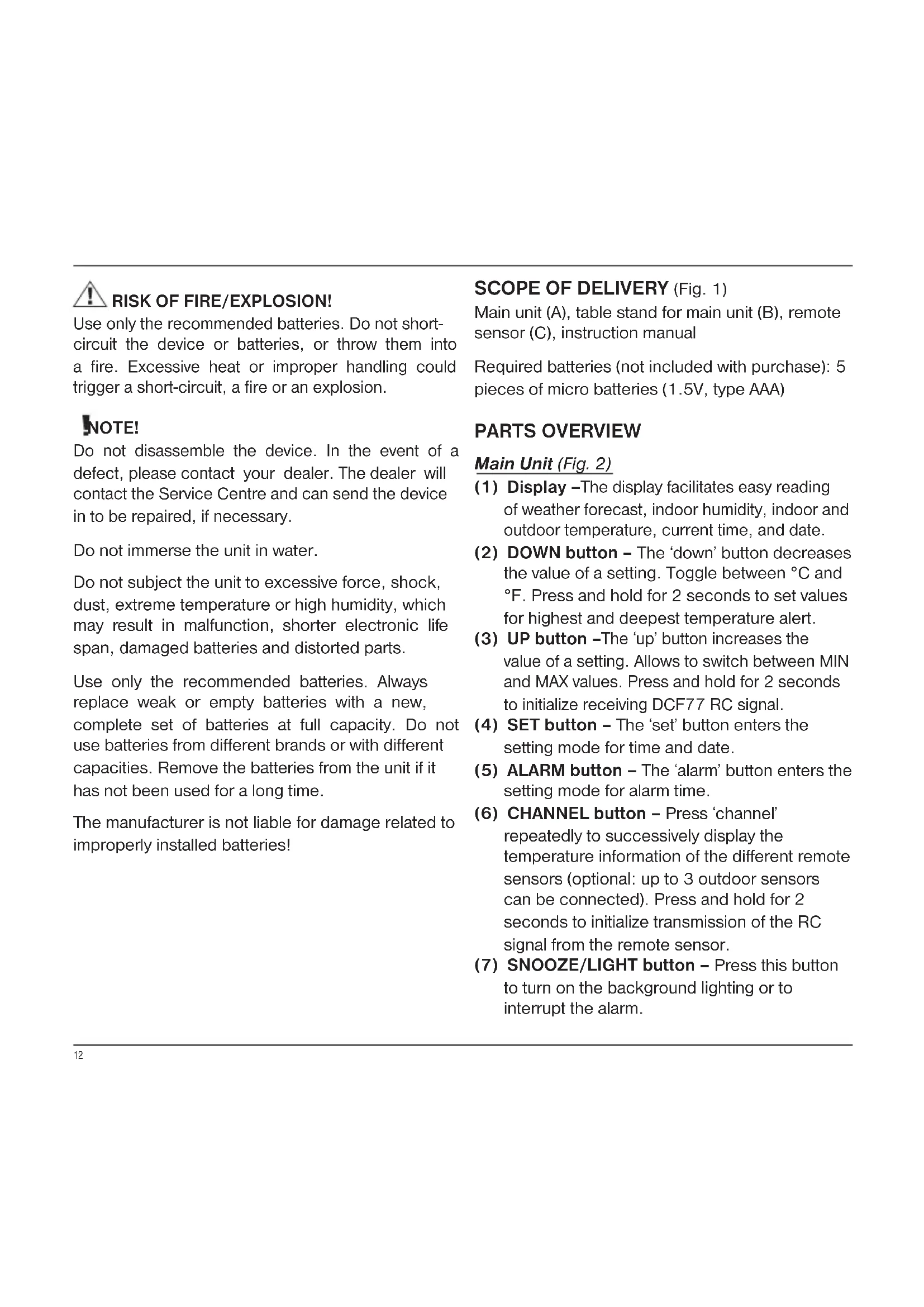 Garantie / Warranty12 RISK OF FIRE/EXPLOSION! Use only the recommended batteries. Do not short- circuit the device or batteries, or throw them into a fire. Excessive heat or improper handling could trigger a short-circuit, a fire or an explosion. NOTE! Do not disassemble the device. In the event of a defect, please contact your dealer. The dealer will contact the Service Centre and can send the device in to be repaired, if necessary. Do not immerse the unit in water. Do not subject the unit to excessive force, shock, dust, extreme temperature or high humidity, which may result in malfunction, shorter electronic life span, damaged batteries and distorted parts. Use only the recommended batteries. Always replace weak or empty batteries with a new, complete set of batteries at full capacity. Do not use batteries from different brands or with different capacities. Remove the batteries from the unit if it has not been used for a long time. The manufacturer is not liable for damage related to improperly installed batteries! SCOPE OF DELIVERY (Fig. 1) Main unit (A), table stand for main unit (B), remote sensor (C), instruction manual Required batteries (not included with purchase): 5 pieces of micro batteries (1.5V, type AAA) PARTS OVERVIEW Main Unit (Fig. 2) (1) Display – The display facilitates easy reading of weather forecast, indoor humidity, indoor and outdoor temperature, current time, and date. (2) DOWN button – The ‘down’ button decreases the value of a setting. Toggle between °C and °F. Press and hold for 2 seconds to set values for highest and deepest temperature alert. (3) UP button – The ‘up’ button increases the value of a setting. Allows to switch between MIN and MAX values. Press and hold for 2 seconds to initialize receiving DCF77 RC signal. (4) SET button – The ‘set’ button enters the setting mode for time and date. (5) ALARM button – The ‘alarm’ button enters the setting mode for alarm time. (6) CHANNEL button – Press ‘channel’ repeatedly to successively display the temperature information of the different remote sensors (optional: up to 3 outdoor sensors can be connected). Press and hold for 2 seconds to initialize transmission of the RC signal from the remote sensor. (7) SNOOZE/LIGHT button – Press this button to turn on the background lighting or to interrupt the alarm.13 (8) Wall-mount recessed hole – This hole makes it possible to mount the main unit on a wall. (9) Battery compartment (10) Table stand – Add if station is to be placed on a flat surface. Remote sensor (Fig. 3) (11) Outdoor temperature (12) Battery compartment (13) CH button – Channel is to be selected at channel 1. (14) Wall mount hole – This hole makes it possible to mount the remote sensor on a wall. (15) °C/°F button – This button selects between Celsius (°C) and Fahrenheit (°F). (16) Table stand – Use this stand to place the device on a flat surface