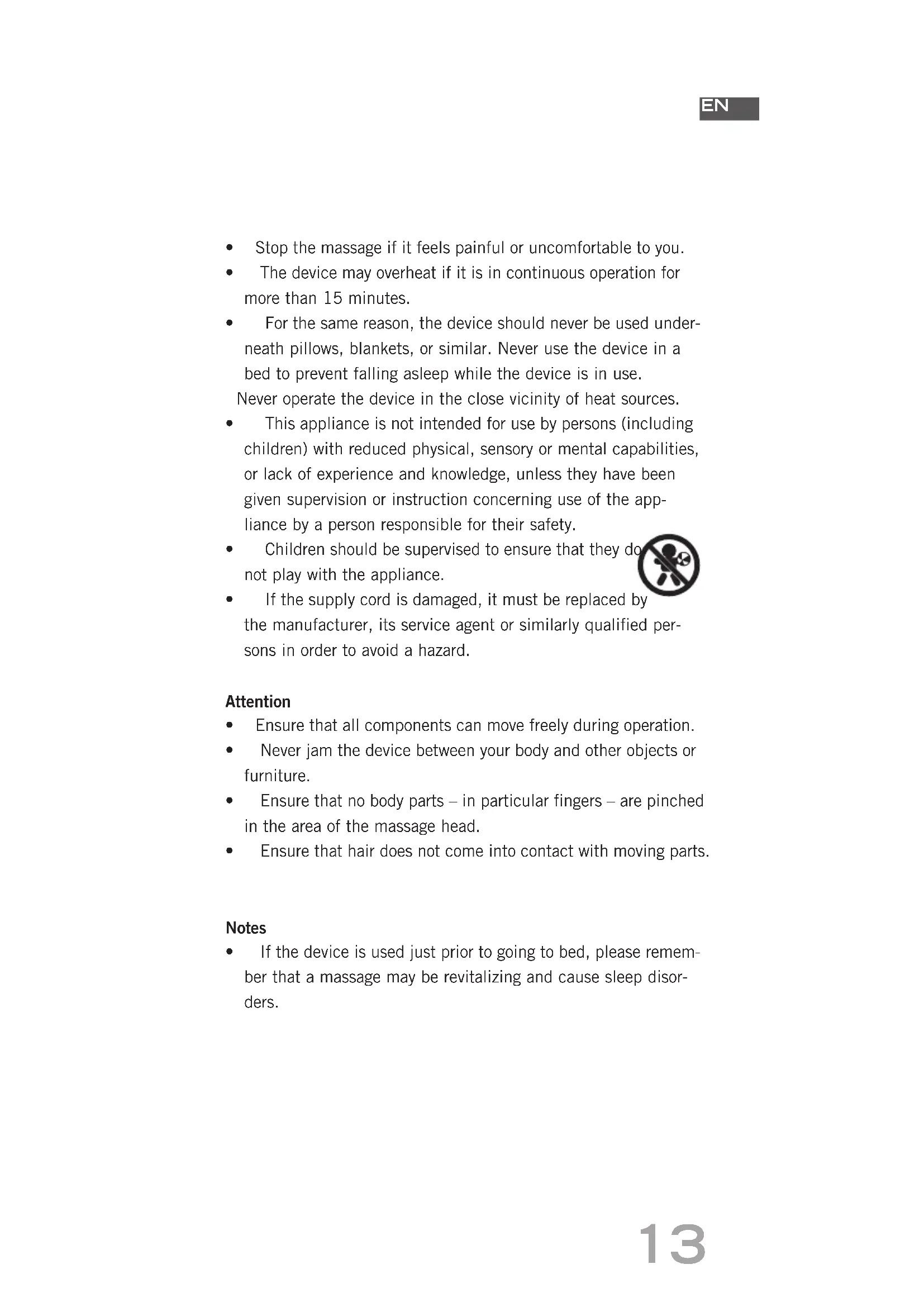 - Ifthedeviceisusedjustpriortogoingtobed,pleaseremem- ber that a massage may be revitalizing and cause sleep disor- ders.14