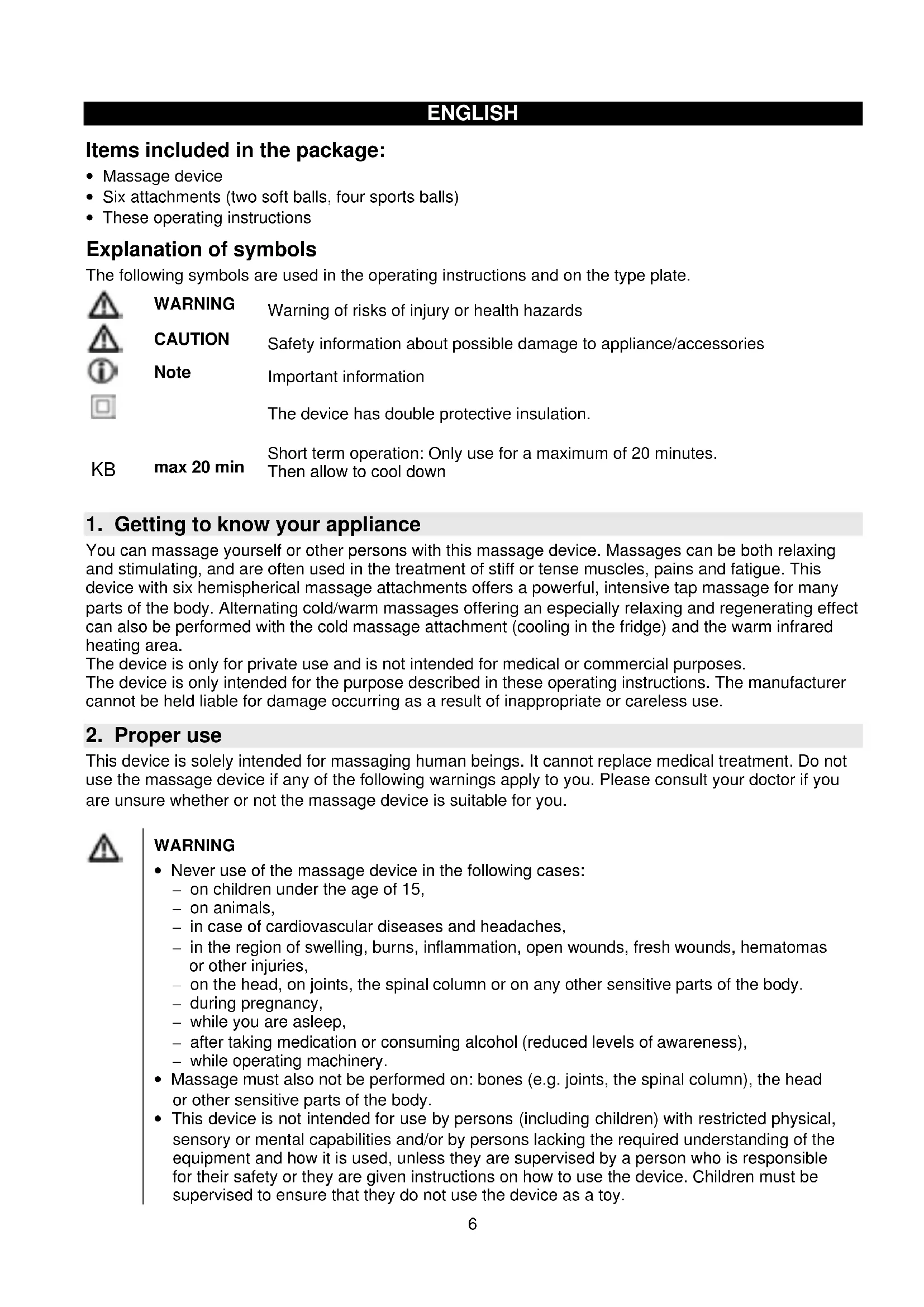 You can massage yourself or other persons with this massage device. Massages can be both relaxing and stimulating, and are often used in the treatment of stiff or tense muscles, pains and fatigue. This device with six hemispherical massage attachments offers a powerful, intensive tap massage for many parts of the body. Alternating cold/warm massages offering an especially relaxing and regenerating effect can also be performed with the cold massage attachment (cooling in the fridge) and the warm infrared heating area. The device is only for private use and is not intended for medical or commercial purposes. The device is only intended for the purpose described in these operating instructions. The manufacturer cannot be held liable for damage occurring as a result of inappropriate or careless use.