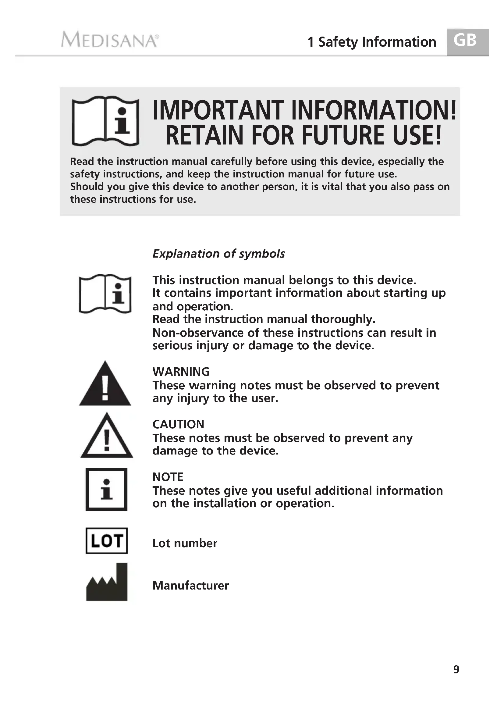 To derive the most success and to enjoy your MEDISANA FRI for a very long time, we recommend that you read the following information on the use and care of the device carefully.