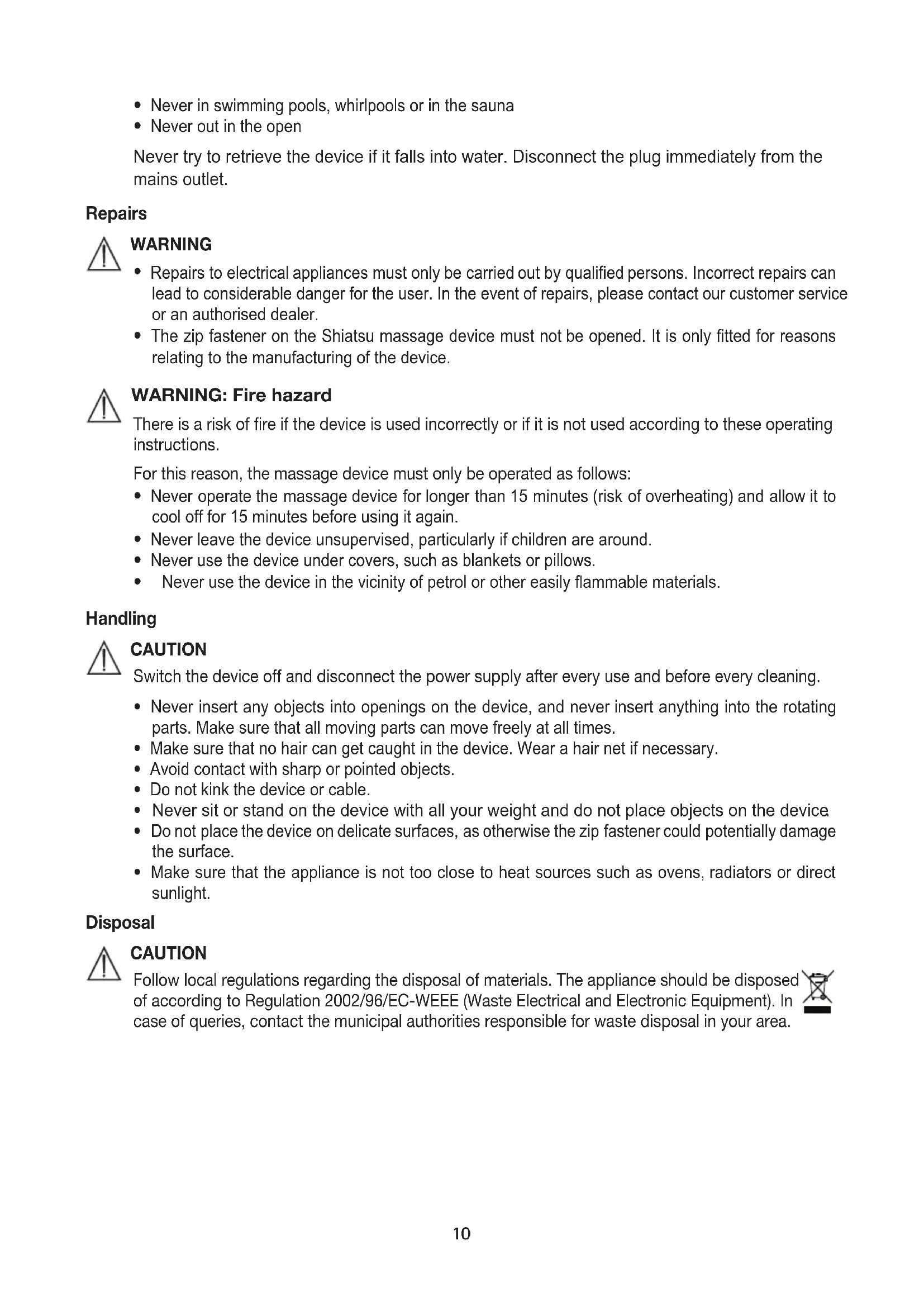 - ThezipfastenerontheShiatsumassagedevicemustnotbeopened.Itisonlyttedforreasons relating to the manufacturing of the device.
