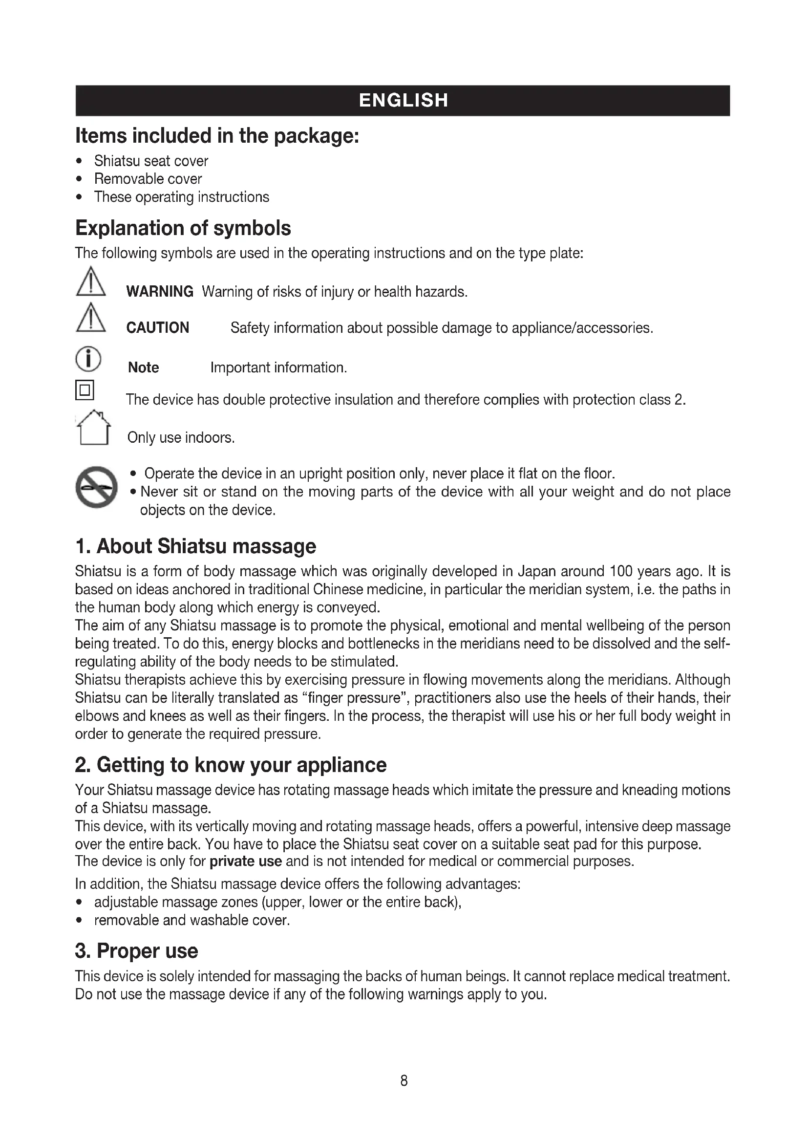 This device is solely intended for massaging the backs of human beings. It cannot replace medical treatment. Do not use the massage device if any of the following warnings apply to you. ENGLISH9 WARNING Use of the massage device is prohibited in the following cases:
