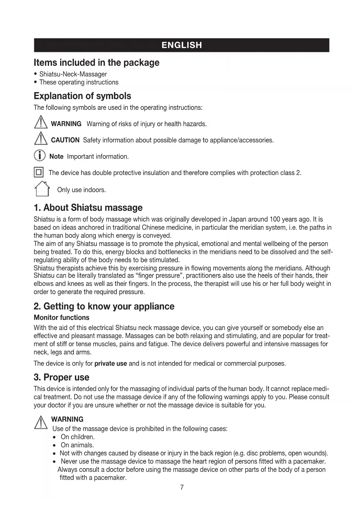 This device is intended only for the massaging of individual parts of the human body. It cannot replace medi- cal treatment. Do not use the massage device if any of the following warnings apply to you. Please consult your doctor if you are unsure whether or not the massage device is suitable for you. WARNING Use of the massage device is prohibited in the following cases: