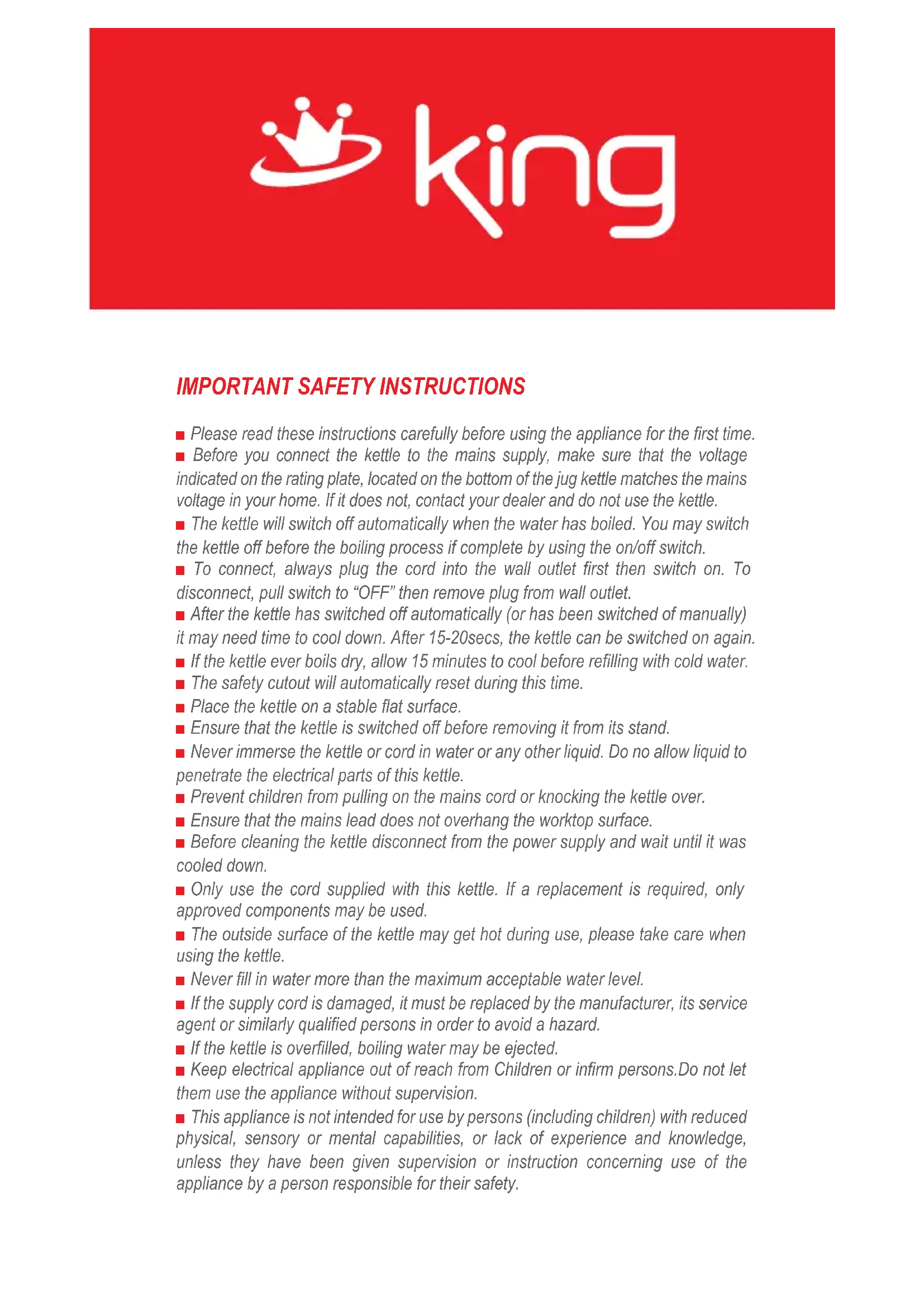 - Never immerse the kettle or cord in water or any other liquid. Do no allow liquid to penetrate the electrical parts of this kettle.