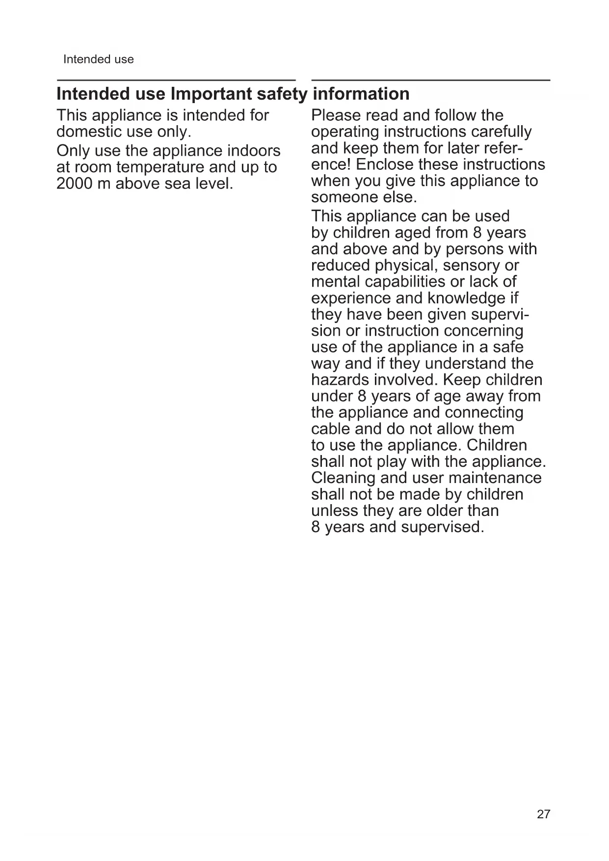 Intended use Intended use This appliance is intended for domestic use only. Only use the appliance indoors at room temperature and up to 2000 m above sea level. Important safety information Please read and follow the operating instructions carefully and keep them for later refer- ence! Enclose these instructions when you give this appliance to someone else. This appliance can be used by children aged from 8 years and above and by persons with reduced physical, sensory or mental capabilities or lack of experience and knowledge if they have been given supervi- sion or instruction concerning use of the appliance in a safe way and if they understand the hazards involved. Keep children under 8 years of age away from the appliance and connecting cable and do not allow them to use the appliance. Children shall not play with the appliance. Cleaning and user maintenance shall not be made by children unless they are older than 8 years and supervised. Intended use Important safety information28 en Important safety information W Warning Risk of electric shock! ■ The appliance may only be connected to a power supply with alternating current via a correctly installed socket with earthing. Ensure that the protective conductor system of the domestic supply has been correctly installed. ■ Connect and operate the appliance only in accordance with the speci cations on the rating plate. ■ Do not use the appliance if the power cord and/or appli- ance are damaged. ■ Only our customer service may repair the appliance, e.g. by replacing a damaged power cord, in order to avoid hazards. ■ Never immerse the appliance or mains cord in water. ■ If there is a fault, pull out the mains plug immediately or switch o the power supply. W Warning Hazard due to magnetism! The appliance contains perma- nent magnets which can a ect electronic implants such as pacemakers or insulin pumps. Persons wearing electronic implants must maintain a minimum distance of 10 cm from the appliance and from the following parts upon removal: milk container, milk system, water tank and brewing unit. W Warning Risk of su ocation! ■ Do not allow children to play with packaging material. ■ Store small parts safely as they can be easily swallowed. W Warning Risk of injury! ■ Do not reach into the grinding unit! ■ Improper use of this appliance may result in injury. W Warning Risk of burns! ■ The milk system becomes extremely hot. After use, always let it cool down before you touch it. ■ After use the surfaces of the heating element or hotplate can remain hot for some time.29