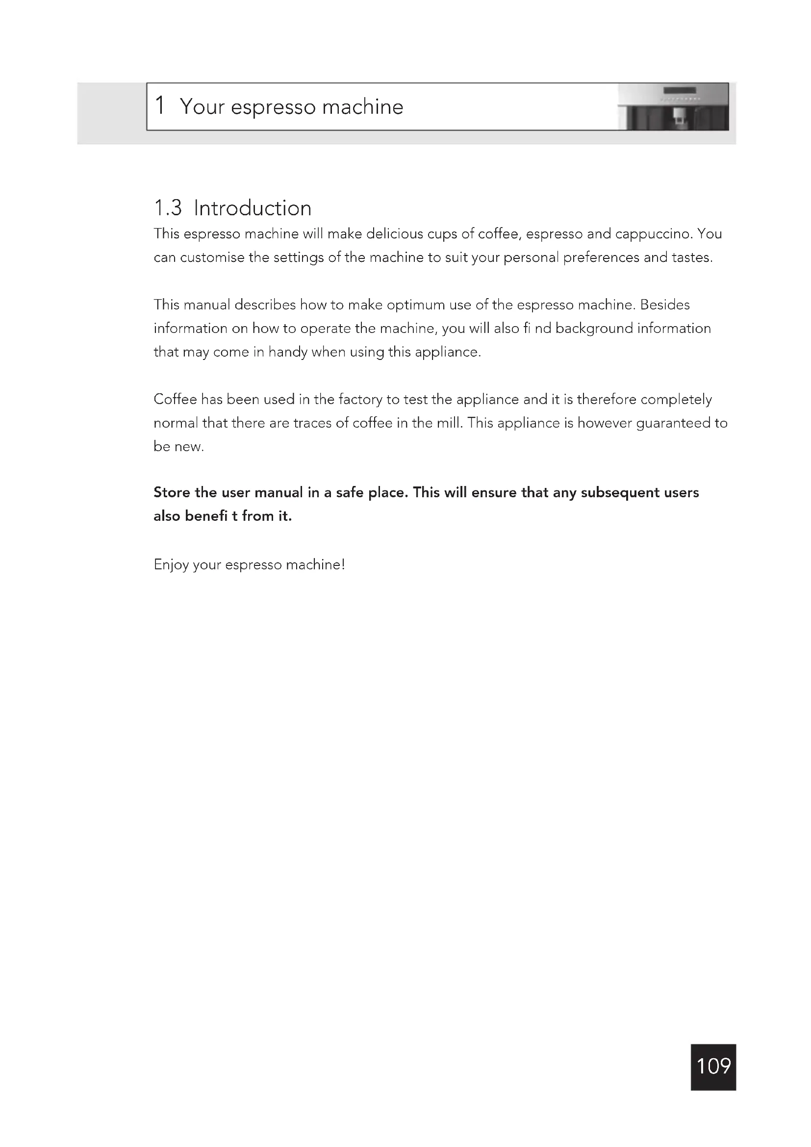 This espresso machine will make delicious cups of coffee, espresso and cappuccino. You can customise the settings of the machine to suit your personal preferences and tastes. This manual describes how to make optimum use of the espresso machine. Besides information on how to operate the machine, you will also fi nd background information that may come in handy when using this appliance. Coffee has been used in the factory to test the appliance and it is therefore completely normal that there are traces of coffee in the mill. This appliance is however guaranteed to be new. Store the user manual in a safe place. This will ensure that any subsequent users also benefi t from it. Enjoy your espresso machine!110 Important matters As with any appliance, there are a number of matters that you should pay attention to.