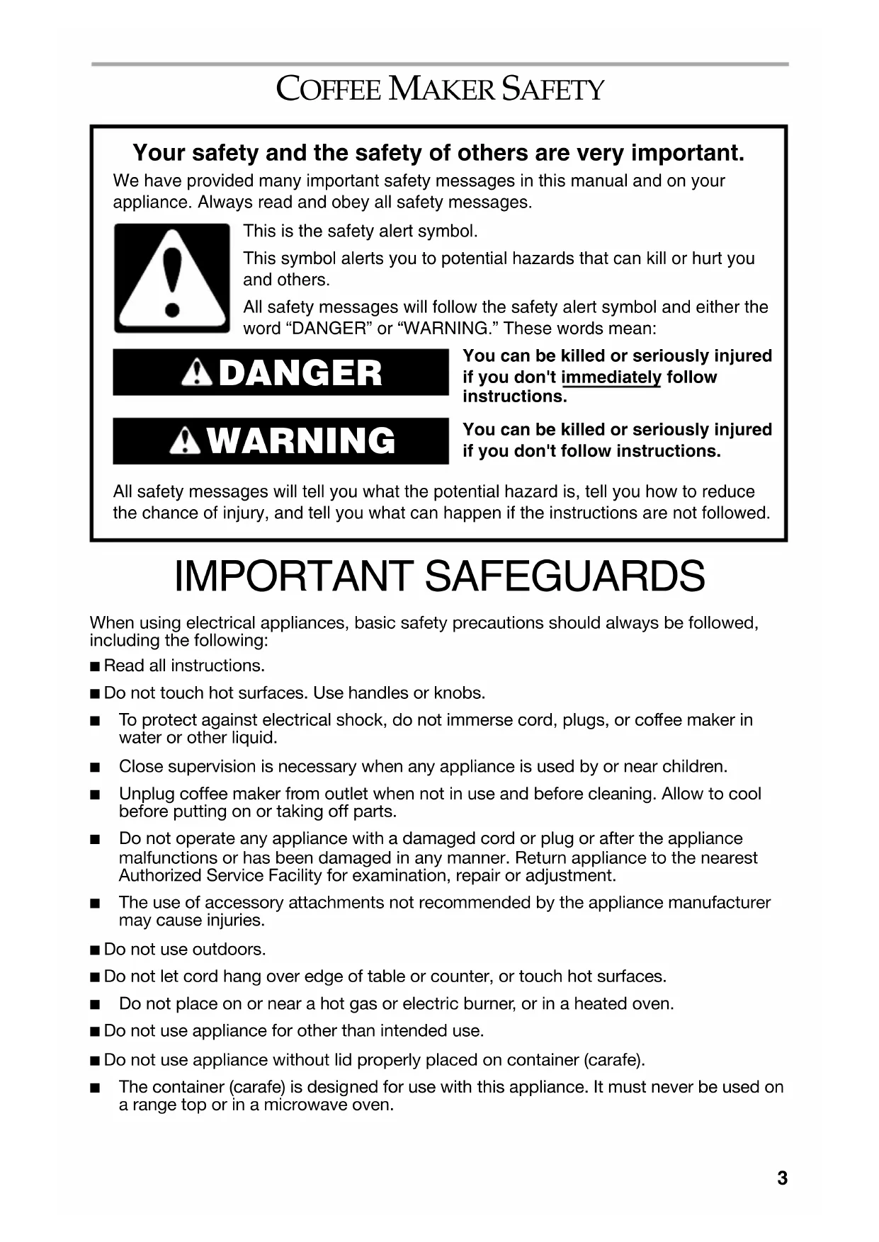 IMPORTANT SAFEGUARDS When using electrical appliances, basic safety precautions should always be followed, including the following:■ Read all instructions.■ Do not touch hot surfaces. Use handles or knobs. ■ To protect against electrical shock, do not immerse cord, plugs, or coffee maker in water or other liquid. ■ Close supervision is necessary when any appliance is used by or near children. ■ Unplug coffee maker from outlet when not in use and before cleaning. Allow to cool before putting on or taking off parts. ■ Do not operate any appliance with a damaged cord or plug or after the appliance malfunctions or has been damaged in any manner. Return appliance to the nearest Authorized Service Facility for examination, repair or adjustment. ■ The use of accessory attachments not recommended by the appliance manufacturer may cause injuries.■ Do not use outdoors.■ Do not let cord hang over edge of table or counter, or touch hot surfaces. ■ Do not place on or near a hot gas or electric burner, or in a heated oven. ■ Do not use appliance for other than intended use.■ Do not use appliance without lid properly placed on container (carafe). ■ The container (carafe) is designed for use with this appliance. It must never be used on a range top or in a microwave oven.You can be killed or seriously injured if you don't immediately follow instructions. You can be killed or seriously injured if you don't follow instructions.All safety messages will tell you what the potential hazard is, tell you how to reduce the chance of injury, and tell you what can happen if the instructions are not followed. Your safety and the safety of others are very important. We have provided many important safety messages in this manual and on your appliance. Always read and obey all safety messages.This is the safety alert symbol.This symbol alerts you to potential hazards that can kill or hurt you and others.All safety messages will follow the safety alert symbol and either the word “DANGER” or “WARNING.” These words mean: DANGER WARNING4 ■ Do not set a hot container (carafe) on a wet or cold surface. ■ Do not use a cracked container (carafe) or a container having a loose or weakened handle. ■ Do not clean container with abrasive cleaners, steel wool pads, or other abrasive material.■ This product is designed for household use only.