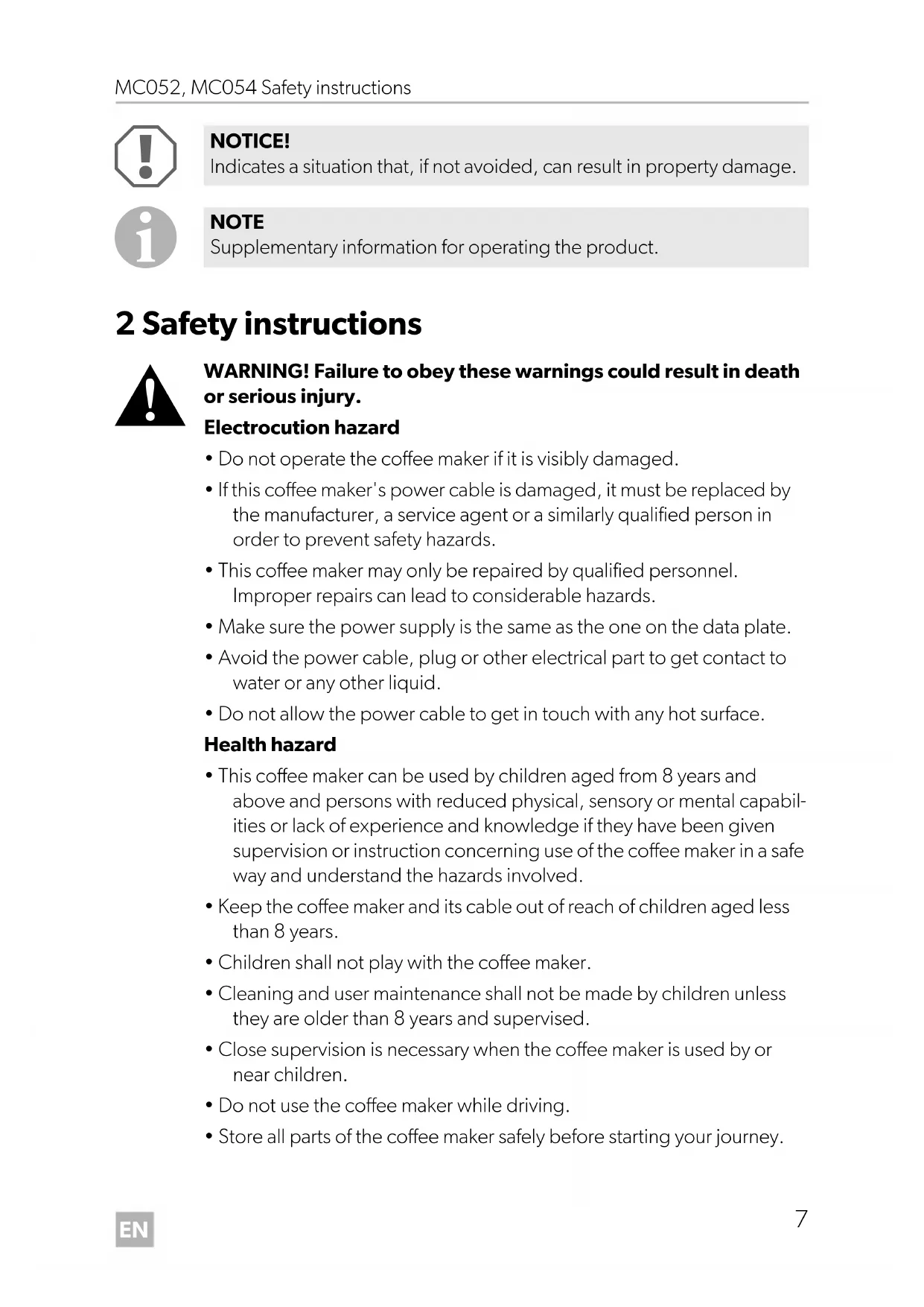 - Store all parts of the coffee maker safely before starting your journey. NOTICE! Indicates a situation that, if not avoided, can result in property damage. NOTE Supplementary information for operating the product. DometicMC052-MC054_IOM_4445101699_EMEA17_20xx-xx-xx.book Page 7 Tuesday, August 3, 2021 12:04 PMEN Scope of delivery MC052, MC054