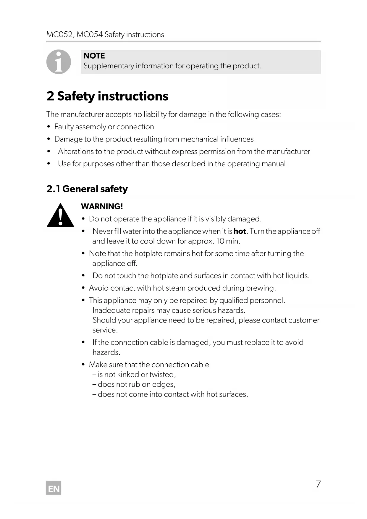 - Do not use sharp or abrasive cleaning agents or hard objects for cleaning, as these can damage the appliance. MC052-MC054-IO-16.book Seite 14 Donnerstag, 25. August 2016 11:50 11EN MC052, MC054 Warranty