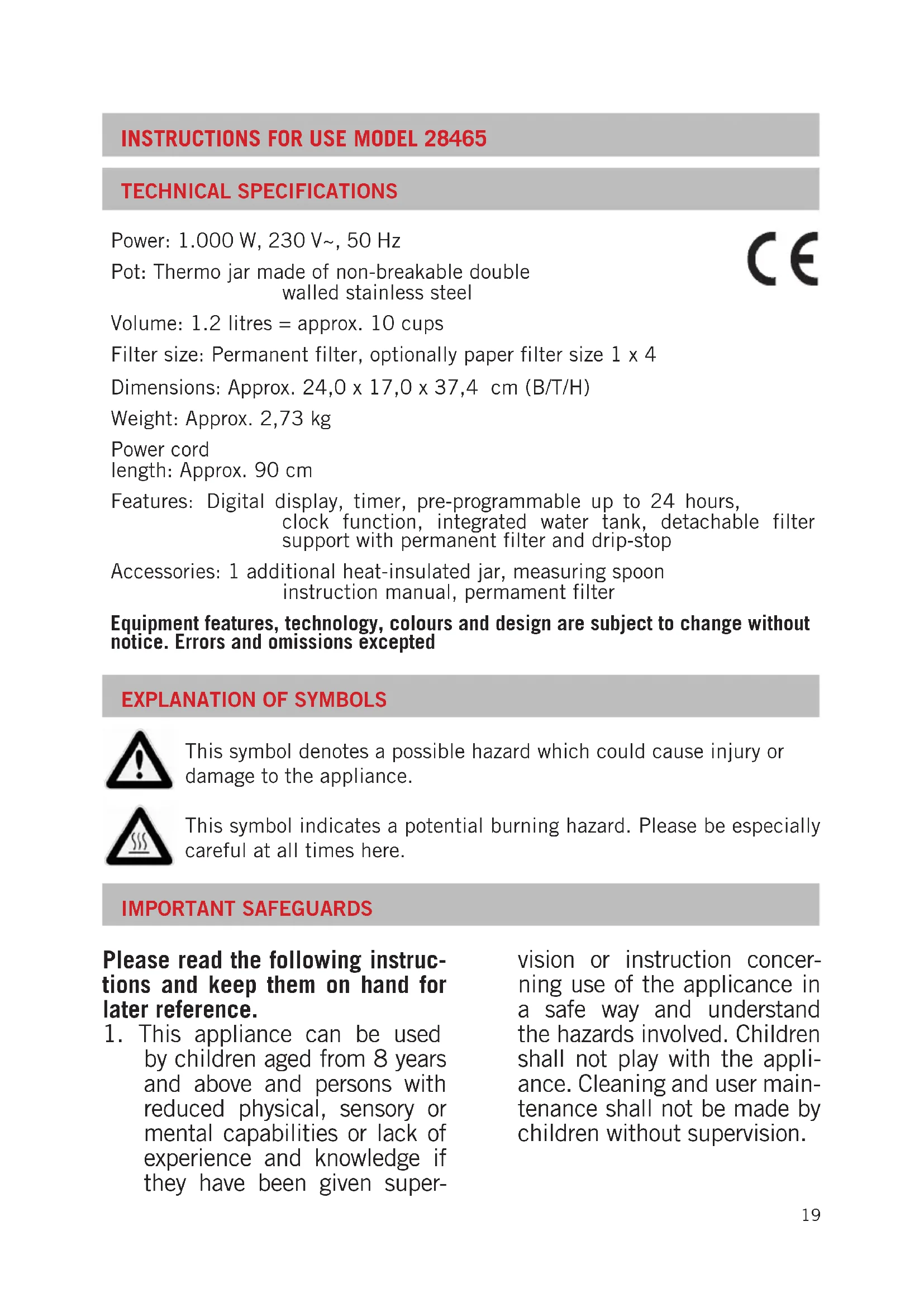 This symbol denotes a possible hazard which could cause injury or damage to the appliance. This symbol indicates a potential burning hazard. Please be especially careful at all times here. IMPORTANT SAFEGUARDS Please read the following instruc- tions and keep them on hand for later reference.