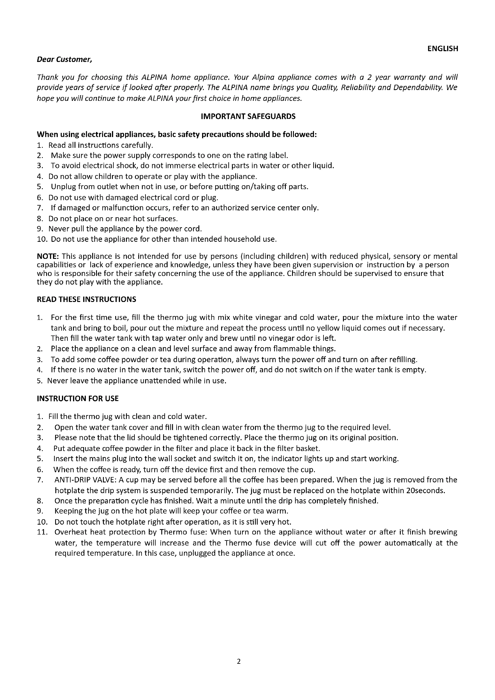 Thank you for choosing this ALPINA home appliance. Your Alpina appliance comes with a 2 year warranty and will provide years of service if looked after properly. The ALPINA name brings you Quality, Reliability and Dependability. We hope you will continue to make ALPINA your first choice in home appliances.